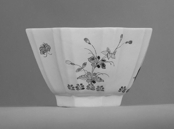 Curator: So, here we have a "Beaker," an exquisite piece crafted by Edme Samson in the 19th century. You can find it on display at the Metropolitan Museum of Art. It's ceramic, primarily porcelain, and falls into the realm of Asian art. What’s your initial impression? Editor: It feels strangely both ancient and brand new. The octagonal shape is interesting. I get this peculiar sense of fragility mixed with, almost, rebellious asymmetry. It’s like holding a captured cloud. Curator: It's interesting you say that because this beaker reflects an important dialogue between cultures and artistic traditions. The floral motifs – flowers and branches – aren't merely decorative; they're part of a rich symbolic language prevalent in Asian art. Each blossom, each sprig carries stories about resilience and beauty, often within specific cultural narratives. Editor: Resilience and beauty, definitely—and in monochrome. There's a delicacy to the dark brushstrokes that makes you want to be ever-so-careful when drinking from it. Though it seems too pretty to use for anything, actually! A decorative paradox! Curator: Precisely. What many viewers may not immediately realize is that Edmé Samson specialized in reproducing ceramics from other regions and earlier periods. The "Beaker" exemplifies 19th-century Orientalism, in which European artists appropriated and reinterpreted artistic styles, forms and designs. It highlights not only intercultural exchange, but also artistic interpretation and how cultural values were – and continue to be – represented through objects. Editor: Knowing that shifts my perception. It’s not just about the art; it's about the layers of appropriation, reinterpretation, almost like a game of telephone across centuries and continents! It makes the simplicity on its surface incredibly deceptive. Curator: Absolutely. It prompts us to question the nature of originality, authenticity, and the role of cultural memory within material culture. Editor: The object, so quiet in itself, sparks conversations about cultural identity. And the weight of those stories sits in something you could probably fit in your palm. Amazing! Curator: Indeed. It invites a more profound appreciation of how artworks are constantly enmeshed with the narratives and assumptions we bring to them. Editor: Leaving me with a slight headache, but a new, thoughtful appreciation for flowery cups, hah. Curator: Indeed. It demonstrates that behind simple appearance we may discern intricate worlds.