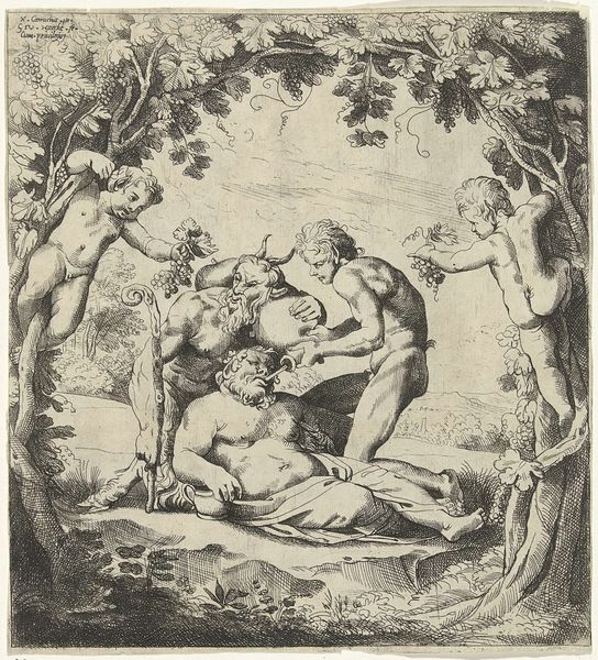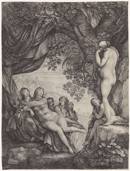 Editor: This etching, "Vertumnus and Pomona" by Moyses van Uyttenbroeck, depicts a scene of classical figures. What strikes me is the contrast between the youthful Pomona and the aged figure beside her. What do you make of it? Curator: It's a fascinating illustration of transformation, isn't it? The aged figure is Vertumnus in disguise, a potent symbol of change and hidden identity. Consider the visual weight of the hooded figure next to the youthful figure, Pomona. What could that juxtaposition suggest about the nature of desire or knowledge? Editor: It makes me think about how wisdom often comes disguised, maybe unexpectedly? Curator: Precisely! It underscores the enduring power of narrative and allegory, suggesting that truth and beauty are often veiled, waiting to be revealed through understanding and experience.
