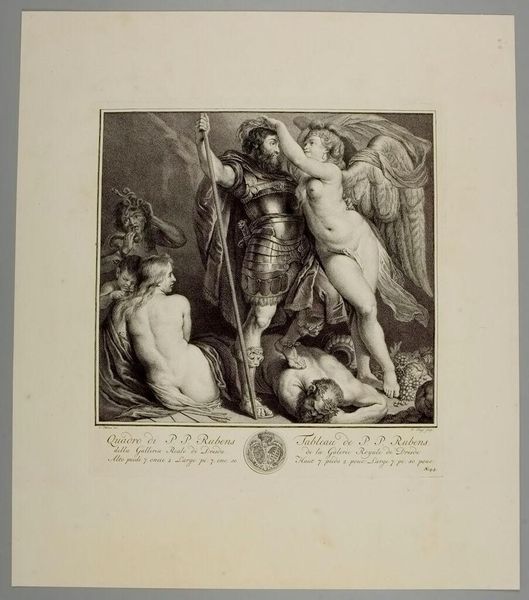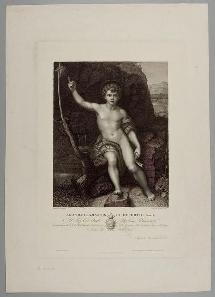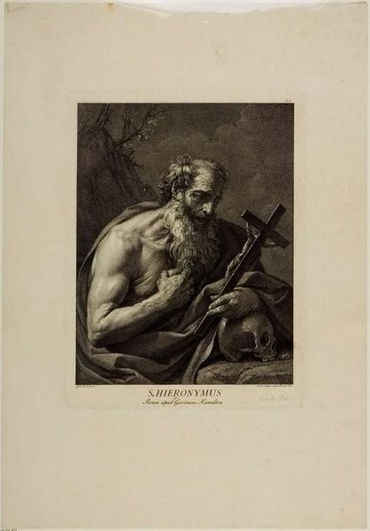 Curator: This engraving presents Pierre Étienne Moitte's "Saint John the Baptist," currently held in the Harvard Art Museums. It strikes me as stark, almost confrontational. Editor: There's an intensity in John's gaze, certainly. The cross becomes not just a symbol but an extension of his will, his unwavering conviction. The two figures behind him seem consumed by doubt. Curator: Absolutely. It is as though Moitte captures the moment of revelation versus skepticism, a timeless human drama. The halo above John confirms his holy status. Editor: The use of line is quite strategic here, isn’t it? The dense hatching in the background throws John into sharp relief. Curator: The artist masterfully uses this technique to highlight John's commanding presence and make him almost tangible. Editor: Indeed. A powerful composition filled with both immediate visual impact and deeper symbolic layers. Curator: Moitte’s work beautifully encapsulates the strength and purpose residing within the figure of Saint John. Editor: A compelling study in contrasts, leaving a lasting impression about faith, doubt, and conviction.
