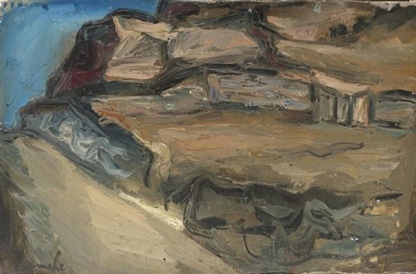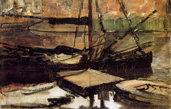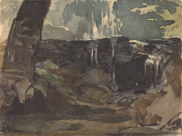 Curator: William James Müller's watercolor, "Donkey and Fowls," has this wonderfully evocative quality. Editor: It feels like a memory, almost faded but intensely felt. The colors are muted, almost dreamlike. Curator: Müller, who lived from 1812 to 1845, had this incredible ability to capture light and shadow, making the ordinary feel quite profound. Look how the dark structure contrasts with the donkey's form. It’s painted with such quick, assured strokes. Editor: Donkeys and roosters, they're such loaded symbols. The donkey can represent stubbornness, but also humility and the working class, while the rooster, is pride and vigilance. Here, though, it's all quite softened. Curator: The combination definitely speaks to something elemental, doesn't it? He's observing a scene that's both completely mundane and full of symbolic potential. Editor: It's as if he's peering into the quiet corners of life, isn't it? A humble little story, really. Curator: Exactly. A fleeting moment made timeless.