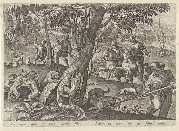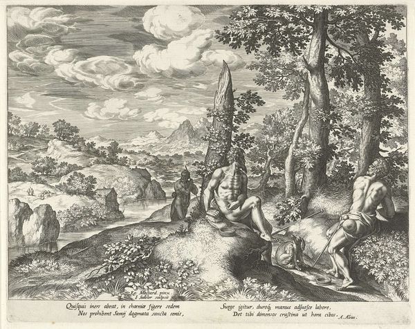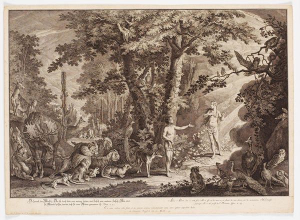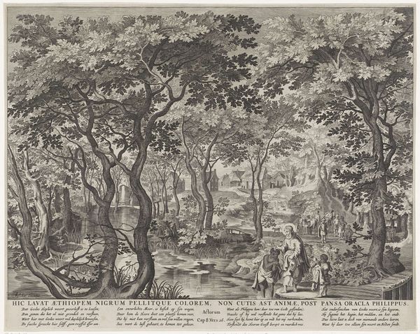 Editor: Here we have "Simson en Delila," a print at the Rijksmuseum, made sometime between 1630 and 1702 by an anonymous artist. It has this old engraving style, quite dramatic! All those lines forming a really rich forest scene. What can you tell me about it? Curator: Look at how the landscape itself becomes a character here. This dense forest, this location, it's not merely a backdrop. The trees twisted, almost writhing – they amplify the drama. This scene echoes a deep anxiety about betrayal. See how Delilah, so central and bright, cuts Samson's hair. This symbol represents a shift of power, an undoing of Samson. The visual elements of this history are fraught with cultural memory; there's almost a cautionary tale embedded here about vulnerability, isn’t there? Editor: Definitely! It's fascinating to consider the landscape as an active element. Why show it within this idyllic scenery? Is this meant to act as dramatic irony, to add depth? Curator: Perhaps the beauty is what makes the betrayal all the more potent. Remember, landscapes weren’t always just pretty pictures. They could be spaces of psychological projection; where fears and desires took root, or perhaps acted to show how something may appear to be pleasant at first glance, until treachery shows its true self? Now, what of the symbolism do you take from the captured Samson? Editor: That's a great point. To look at how landscape holds multiple meanings makes me wonder, what would this forest represent to its original audience? Thank you! Curator: Indeed, it's through understanding such layers that this seemingly straightforward scene begins to reveal its lasting impact and cautionary roots. A reminder of how visually history speaks.