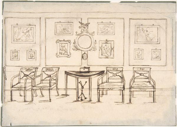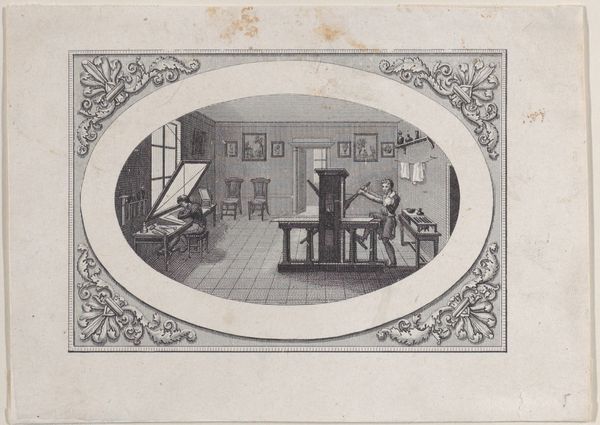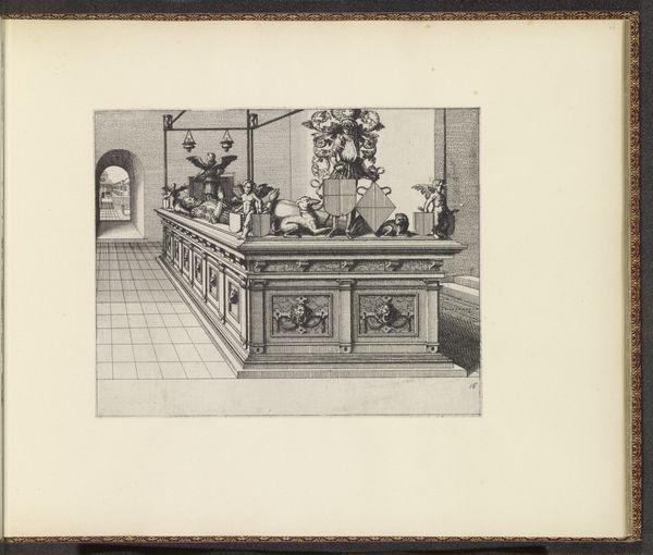 Curator: This is “Kabinet van Sébastien Leclerc,” made with ink, etching, and engraving during the late 17th or early 18th century, now at the Rijksmuseum. The image shows the workshop of the artist. It seems busy! Editor: Yes, busy and controlled. So many tools. And a meeting happening center stage! What is that cabinet’s story? Curator: The depicted objects—mathematical instruments, models, and artwork—were commodities. It underscores how artistic and scientific practices intersected. These items were luxury goods reflecting the patronage of Leclerc's time. This setting highlights how artisanal labor contributed to culture under elite commissions. Editor: And that brings up questions about access to knowledge and power. It seems Leclerc situates his role within an evolving socio-political structure. His prints, multiplied and circulated, served as knowledge disseminators but for whom, and controlled by whom? It brings light to these early formations of "public" intellectual spaces and raises many questions about its audiences. Curator: Certainly. Notice the details: see the lines on the wall? This artwork acts as a diagram of itself, emphasizing perspective and technique within the workshop. The print reveals the intersection of artisanal and artistic production. Its display reflects a calculated presentation for an elite audience. Editor: I agree, it invites analysis that expands on how spaces produce and reproduce societal order, revealing both innovation and limitations in the early Enlightenment-era structures. The composition almost presents these endeavors—science and art—as acts performed on display within systems that privileged specific kinds of intellect and influence. Curator: Fascinating. Leclerc meticulously details instruments as objects with productive potential. From a materialist viewpoint, one might question whether art provides genuine knowledge or if it is more akin to showcasing technological commodities within a closed sphere of academic elite. Editor: Yes, and examining who benefitted or bore burdens from this "knowledge revolution" gives critical purchase over conventional narratives! What seems innovative on the surface contained systems perpetuating uneven social relations that are just becoming clear! Curator: Ultimately, a piece that encapsulates evolving tensions present between craftsmanship and enlightenment philosophy. Editor: Agreed. Art and society caught in dynamic tension then, much like they still are now!