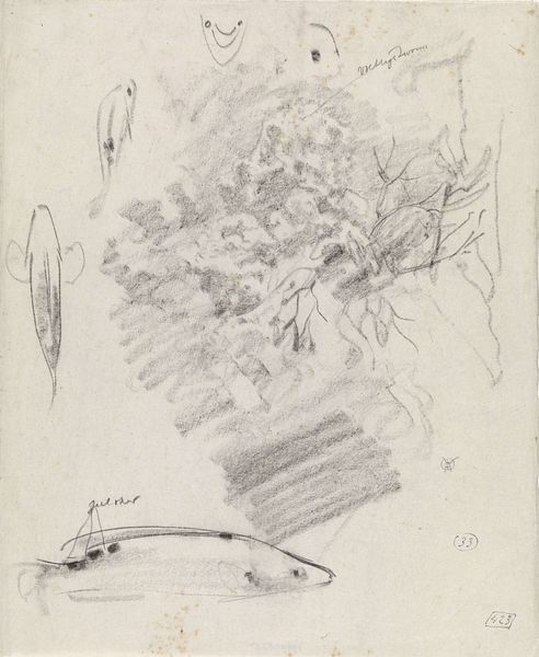 Curator: Let's turn our attention to this intriguing sketch. It’s titled "Schets van een aquarium met vissen," or "Sketch of an Aquarium with Fish," by Gerrit Willem Dijsselhof. The work is held here at the Rijksmuseum, created sometime between 1876 and 1924, rendered in pencil on paper. Editor: It feels like peering into a secret world, doesn't it? There’s a whimsical quality to the drawing, almost childlike, yet also with an intensity in the close observation of form. Curator: Dijsselhof was very involved in the Dutch art scene and in thinking about design and societal engagement with art. Consider how aquariums became increasingly popular during this period, representing a sort of contained nature, bringing exotic life into the domestic sphere, which may be relevant. Editor: Absolutely, the idea of contained nature. I’m thinking about how these early aquariums, or even the popularization of goldfish bowls, changed our relationship with aquatic life. Was it really about appreciation, or more about control? There's something deeply symbolic in taking the 'wild' and putting it on display. What narrative about humanity and its relationship with the environment might Dijsselhof have been engaging with? Curator: I'd argue that, based on the artist’s broader intentions, there is an intention to call people into a dialogue, perhaps an interrogation of this human desire to dominate and collect. The delicate lines feel almost tentative. There is a sensitivity here, not simply exploitation. It could be seen as an early ecological statement about human impact. Editor: It raises some key questions regarding art's function and political charge during periods of increasing ecological consciousness. By depicting an aquarium, does Dijsselhof critique or celebrate this artificial ecosystem? I find this dialogue to be very much alive in this subtle artwork. Curator: Well, it’s a complex drawing, isn't it? Presenting multiple layers. There's an undeniable beauty here, but the questions you raise are vital. Thank you for highlighting such an important perspective on this work.