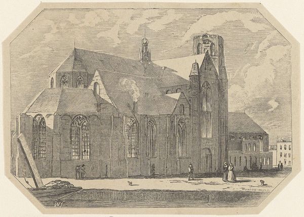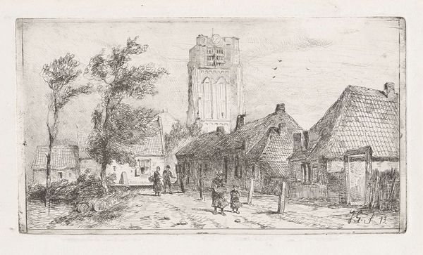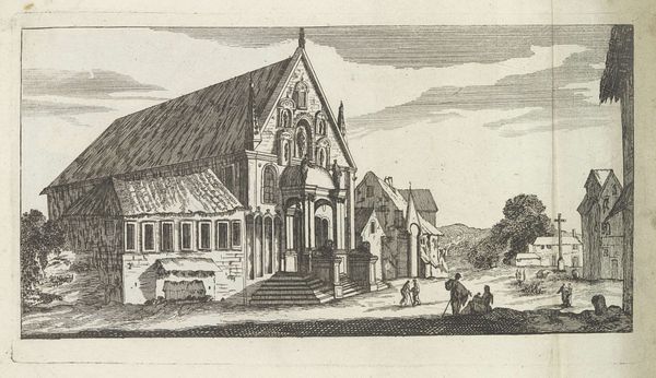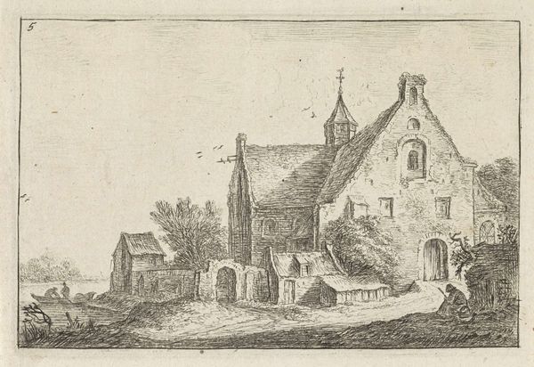 Editor: This is "Sloter Kerck," an etching by Geertruydt Roghman. The stark contrast between the ruined structure and the functional church creates such a strong visual dichotomy. What do you see in this piece beyond just the architectural depiction? Curator: This work makes me consider the role of women artists in the 17th century, often relegated to landscapes and genre scenes, but still subtly commenting on larger societal shifts through those very subjects. Editor: Shifts? Like what? Curator: Well, think about it. What does it mean to show a ruined church alongside a functioning one, especially in a time of religious and political upheaval in the Netherlands? Roghman is engaging with ideas of power, decay, and the resilience of faith. The choice to depict the church from a low vantage point might symbolize solidarity with ordinary people, perhaps those most impacted by these historical tensions. What do you think? Editor: That gives me a completely new way to look at her piece. It's not just a landscape.