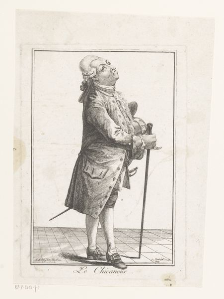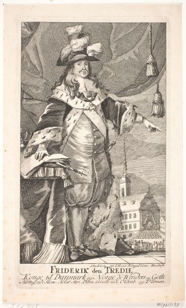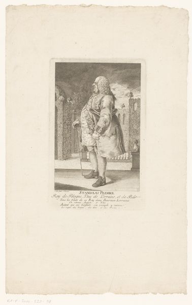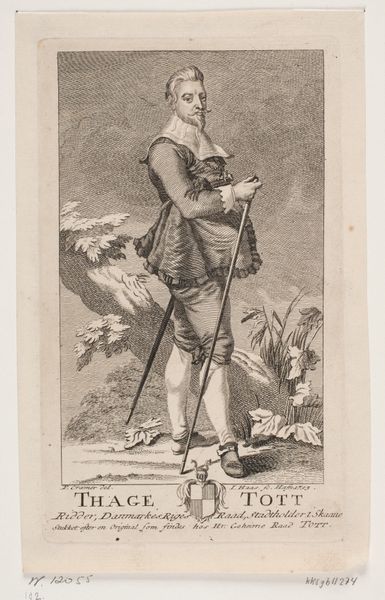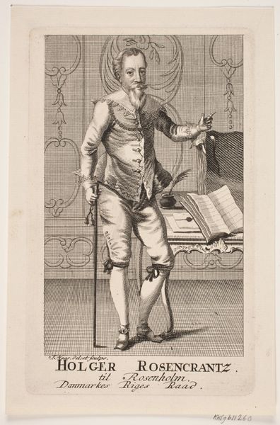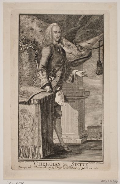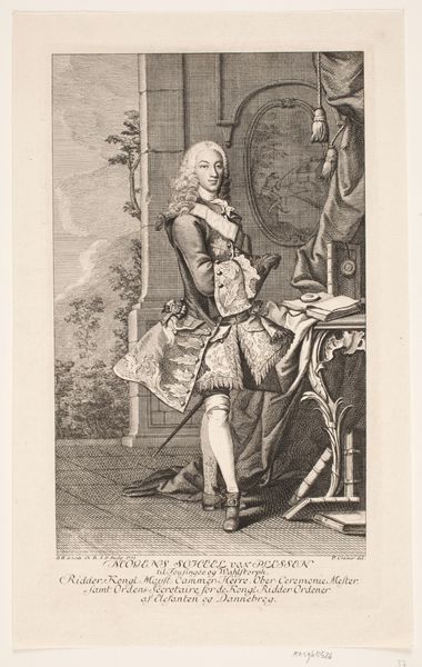Editor: This is "Generalmajor Otto F.A. von K\u00f8ppern," a 1791 engraving by Carl Daniel Voigts. The General looks rather stiff and formal, holding his hat and cane in this grand setting. What can you tell me about the symbolism here? Curator: Notice the architectural backdrop – the columns, the patterned floor, even the urn. These neoclassical elements suggest order, reason, and a connection to classical virtues. How does that fit with what we know about the subject and the era? Editor: Well, as a General, he'd represent order and authority. And wasn't neoclassicism popular with elites at the time? Curator: Exactly. It's a deliberate association of the individual with power, stability, and timeless principles. And observe the way he holds the hat. Is it a gesture of deference, or perhaps contained power? How do you feel about his gesture, and his placement in this image? Editor: It seems almost like he is displaying, but withholding, that power. It is an assertion, but an aristocratic, considered assertion, not aggressive. What about his decorations; what story do they tell? Curator: They signal not only his rank and service to the state but also link him to a larger symbolic order. Medals were and are always cultural memory, laden with connotations about honor, duty, and social standing. Their visual presence reinforces his authority. Note also how his gaze doesn't meet ours. He's looking into the distance, perhaps suggesting future campaigns, further accomplishments, even his legacy. Editor: It’s interesting how all these elements – architecture, costume, gesture – combine to create this very specific image of power and status. I hadn’t thought about the gaze and the hat. Curator: Absolutely! The visual language of portraiture is quite specific. And paying attention to those subtle clues lets you decode deeper meanings. Editor: I’ve certainly learned to look a little closer today. Thanks for sharing your expertise!