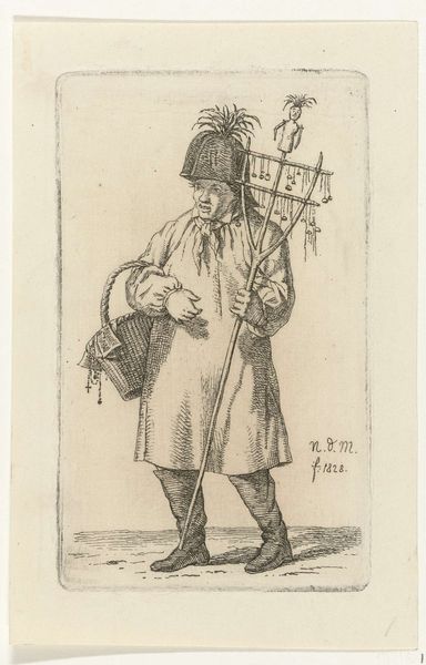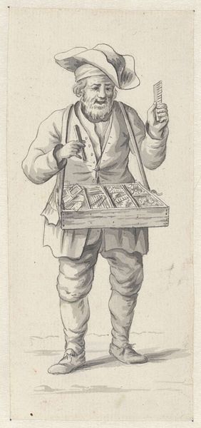 Editor: So, this is *Marskramer*, a print by Pieter de Goeje, dating back to between 1789 and 1859. It's got this kind of, almost comical, quality – very much feels like a character sketch. What's your interpretation of this character? Curator: Notice how the print medium itself reinforces the theme of accessibility, mimicking the way these peddlers brought goods directly to the people. Beyond a simple caricature, observe how de Goeje uses clothing and wares to communicate this man’s social standing and occupation, connecting to established tropes of the “merchant” figure. Where else might we see allusions to similar archetypes in other media? Editor: So, he’s more than just a funny drawing; the symbolism reinforces a common societal role. The clothing does feel like it fits a “type”, yeah. Like, a stage character! Curator: Precisely! And consider the comb held aloft— a universal symbol of grooming and order, even vanity— juxtoposed with the tools held in his opposite hand, the instruments he uses, creating a dialogue about status, identity, and what people value from this merchant’s trade. It carries so many layers. What story does the arrangement of these tools convey to you about his time and place? Editor: Wow, I hadn’t even considered how the specific goods related to the man himself. Seeing those connections… changes everything! Curator: And it shows how symbols shift and settle with context, accumulating nuance and association over time. Always consider the context! Editor: I'll remember that - it makes analysing the meaning so much richer! Curator: Indeed. De Goeje provides a unique lens to examine cultural values and social hierarchies from over a century ago. There's more than meets the eye, isn't there?