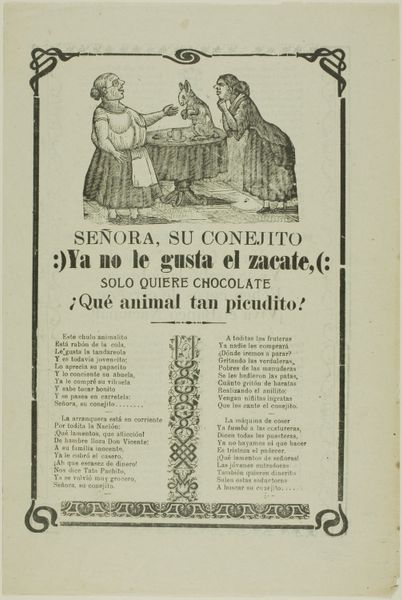 This broadside, "Laments of a Helpless Orphan," was printed by Manuel Manilla in Mexico, likely at the end of the 19th century, using relief engraving. The sombre tonality results from the limited tonal range achieved through the printmaking technique. Visually, the composition is divided into three distinct parts: the illustration at the top, the title in the middle, and the lament text below, all within a decorative border. The linear quality of the engraving gives the image a stark, graphic feel. Notice how the orphan figure is rendered with simple lines, emphasizing the emotional weight of the scene rather than naturalistic detail. The arrangement of text and image creates a visual structure mirroring the lament itself. The rigidity of the layout, framed by decorative borders, contrasts with the fluid emotion expressed in the verses, destabilizing the traditional sentimental values associated with the image of a bereaved child. The broadside functions as both an artistic expression and a semiotic sign, communicating complex cultural codes around grief, religion, and social status within the Mexican context.