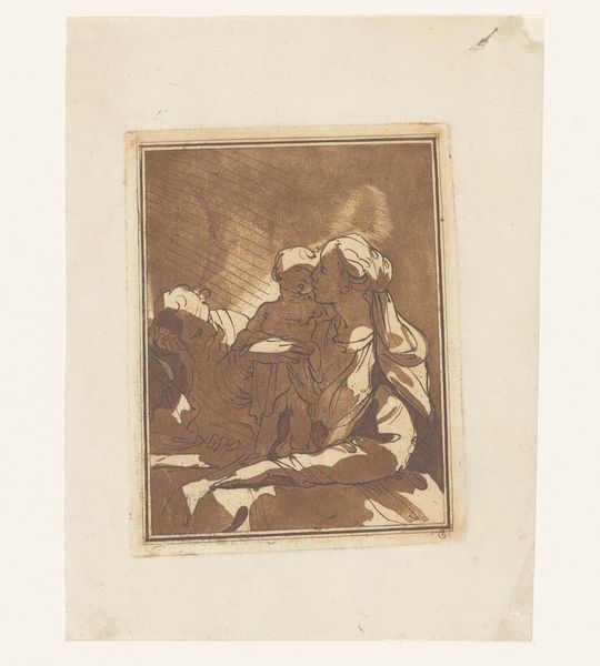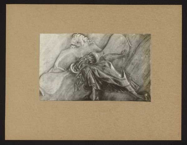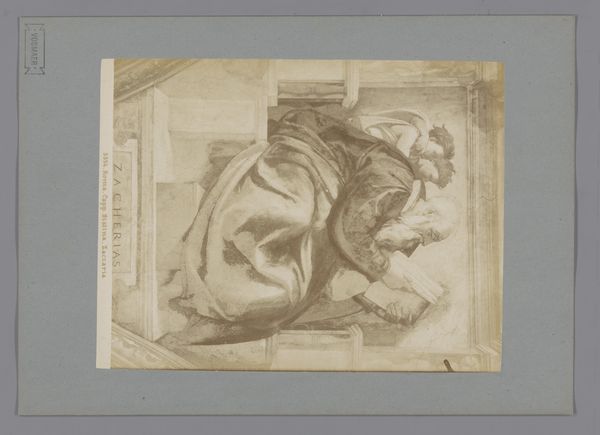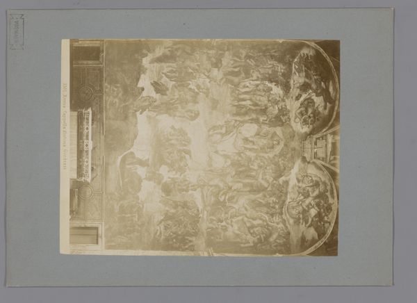 Curator: This intriguing photographic reproduction dates from between 1851 and 1900. It depicts Michelangelo's fresco, "The Separation of Light from Darkness," found on the ceiling of the Sistine Chapel. Editor: It has an almost ghostly presence in monochrome. The swirling composition creates a potent sense of movement, though the textures look quite abraded. Curator: Indeed. Considering its display in the Vatican, this scene takes on further weight. The chapel itself was a declaration of papal power, and this fresco specifically reinforces the church's narrative of divine creation and control. Editor: Function within the Vatican aside, one is immediately struck by how Michelangelo uses purely visual devices to communicate such an abstract concept. Light and dark, reduced to swirling masses of figuration. The gestures of the figures are almost violent. Curator: I find the visual weight Michelangelo employs to be very impactful. You get this dramatic contrast between the turbulent darkness, realized in deeper, denser pigments, and the emerging light, expressed in the high key areas and lighter application of material. Editor: The very act of photographic reproduction interests me here. What impact did photography have on disseminating artwork to broader audiences, or even changing understandings of the fresco? Curator: Precisely! Photography certainly made Michelangelo's work accessible as never before, circumventing class and geography, though invariably at a loss of crucial sensory data, like depth, and texture. It's a flattened perspective, both literally and metaphorically. Editor: And here we are today, considering yet another generation's perspective through this artwork’s extended history of imaging and access. I hadn't anticipated such layers to this reproduction. Curator: Yes, these juxtapositions of time and representation grant new insights into enduring themes, a visual echo of creation's very first moment.