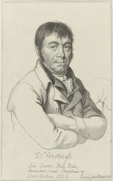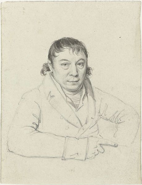 Editor: Here we have Jacob Ernst Marcus's "Portrait of the Draughtsman Dirk Versteegh," created sometime between 1784 and 1826. It's a graphite drawing, currently held at the Rijksmuseum. It strikes me as very direct and somewhat reserved, a very...stiff, rendering of this artist, Mr. Versteegh. How do you interpret this work? Curator: That 'stiffness,' as you call it, is very telling, isn't it? While formally, it operates within the conventions of portraiture—and we could discuss its relation to realism and Romanticism—it also gives us a glimpse into the social codes of the late 18th and early 19th centuries. Look at the sitter’s pose, his clothes. How might those details speak to ideas around masculinity, class, and artistic identity at that time? Editor: I see what you mean! His posture and attire do present a carefully constructed image of bourgeois respectability. Do you think it's also fair to suggest it might also reflect the limitations placed upon artists and the prevailing gender dynamics of that time? Curator: Absolutely. Artists were increasingly negotiating their position within a changing social landscape. His crossed arms could signify defense or introspection, perhaps even subtly hinting at the constraints of a patriarchal society or the struggle for artistic recognition. We have to remember how portraiture often functioned to reinforce social hierarchies and power structures, so where might Versteegh position himself with this portrait of another artist? Editor: So it's more than just a likeness; it’s a social and political statement as well. I hadn't considered it in such depth. Curator: Precisely. Examining art through an intersectional lens—considering gender, class, race, and power—allows us to excavate deeper layers of meaning. Editor: Thank you. This has completely transformed how I view portraiture and its role in shaping social narratives. Curator: It's exciting to uncover the layers that make art history speak to our contemporary condition.