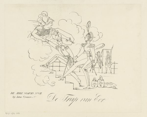 Johan Michaël Schmidt Crans created this print in 1860 as a commentary on A.C. Kruseman's book, 'Historical Women.' The cartoon offers a glimpse into the cultural and intellectual debates around history, gender, and national identity in the Netherlands. Here, Kruseman, guided by Clio, the muse of history, is confronted with the very women he has written about, figures who seem to be emerging from the depths of history to challenge his interpretation. The print uses the visual language of caricature to critique Kruseman's historical work. Consider how the artist uses exaggeration and symbolism, and how the choice to depict historical figures as specters reflects a particular view of history. Understanding this image requires that we delve into the contemporary reception of Kruseman's book and the broader context of historical writing in the Netherlands. This print underscores the importance of understanding the social conditions that shape artistic production and reception.