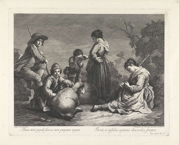 Editor: This engraving, "Herdersfamilie in een landschap," probably made between 1747 and 1812 by Pellegrino dal Colle, depicts a shepherd family in a landscape. It gives off this old-timey, baroque vibe. The central figure seems so detached. What do you see in this piece, from your perspective? Curator: I see a highly constructed image perpetuating a romanticized, and frankly, false narrative about rural life. This isn't a snapshot of reality but an ideal, likely catering to an elite urban audience longing for a simpler time. Note the carefully arranged figures, the implied leisure, even the cleanliness – this belies the harsh realities of 18th-century agrarian existence. Where is the toil? The poverty? The disease? It's absent, sanitized. What do you think this absence says about the intended audience and the social function of this image? Editor: So, it's less about showing life as it *is* and more about telling a specific story, for a certain audience, perhaps about their values and what they wished for? I hadn't really thought about who *wasn't* in the picture. Curator: Precisely. We have to question the power dynamics inherent in representations like these. Who gets to tell the story, and whose voices are silenced? Consider the composition – who is centered? Who is relegated to the periphery? This isn’t just about art; it’s about social hierarchies and the perpetuation of dominant ideologies. What’s your feeling now about that central figure? Editor: Thinking about it, her ornate clothes and pristine appearance now stand out to me, really reinforcing the artificiality. It feels much more staged than at first glance. Thank you for providing an interesting lens for looking at this piece! Curator: And thank you for engaging with the work critically. These types of engravings can tell us much more about the era, when we look for what is *not* visible as well as what is.