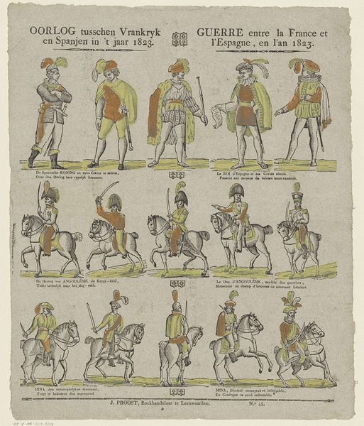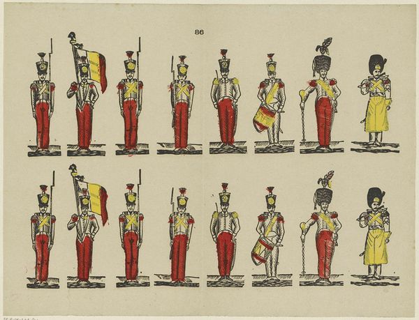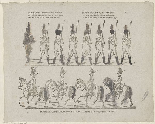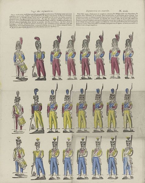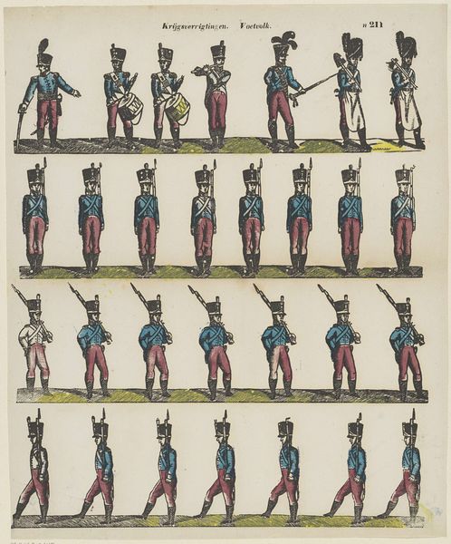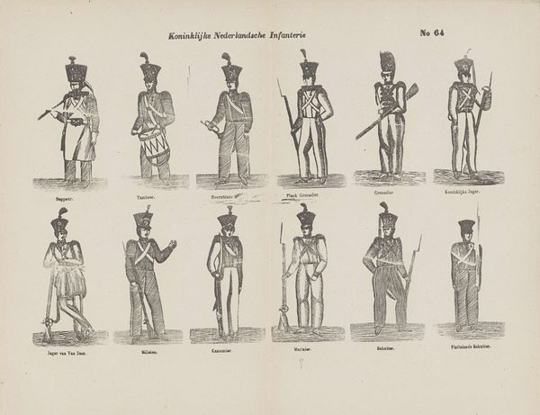 Curator: The rows of soldiers stand to attention, starkly outlined in pen and print—it’s rather unsettling, like a parade of automatons. I can almost feel a rigid and oppressive sense of duty. Editor: Indeed. The Rijksmuseum holds this work, “Koninklijke Nederlandsche Infanterie,” created sometime between 1832 and 1850 by Theodorus Johannes Wijnhoven-Hendriksen. What we see is a print, likely mass-produced, showing the ranks of the Royal Netherlands Infantry. Curator: Each figure is subtly distinct, their titles carefully listed beneath – "Sapper," "Drummer," "Grenadier". I read these more like archetypes than portraits, meant to represent facets of military force rather than actual individuals. It makes you wonder about the human cost within. Editor: It's fascinating how this piece operated within 19th-century Dutch society. The uniforms, the rigid stances – these visuals heavily contributed to national identity. Visual culture during that period played a pivotal role in creating social order, and a shared sense of "Dutch-ness" perhaps? Curator: Precisely. The crisp lines of the drawing almost evoke the sense of military precision itself, while each distinct figure creates a narrative web around power. One begins to wonder what fears and aspirations lay beneath those uniforms, and to what degree the individual identities were suppressed for the greater order. The uniforms themselves speak volumes about codified status and symbolic representation of rank. Editor: It makes you wonder, what was the impact of popular imagery like this one on young men considering joining the army? How did it romanticize or sanitize the realities of war, bolstering nationalistic sentiment? The publisher would certainly have commercial interests tied into larger political movements. Curator: Perhaps we shouldn't underestimate the propaganda inherent within these neat rows and stylized depictions. But the human mind resists complete absorption by such imagery, instinctively seeking cracks, discrepancies, and untold stories behind each iconic face. Editor: True. We could see this print as a stark illustration of the period's efforts to standardize the military, embedding symbolic meaning in every buckle and button to construct something as persuasive as an emerging collective consciousness. Food for thought.
