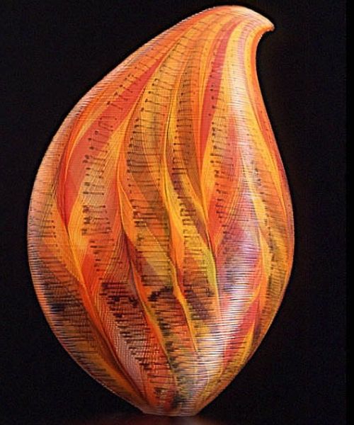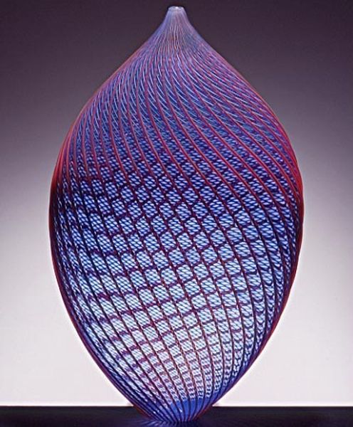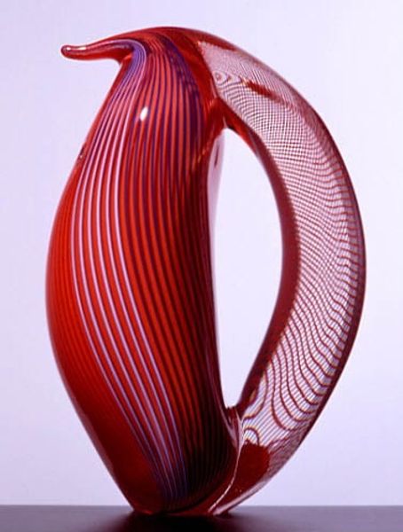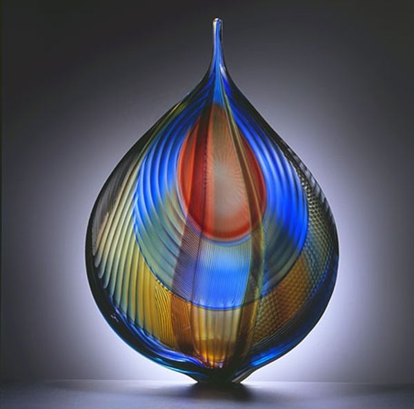 Editor: Today we’re looking at Lino Tagliapietra’s “Coronado,” a striking glass sculpture. The form itself is so elegant and simple, almost teardrop-like, but then you get caught in the complex patterns within the glass. What's your first impression of this work? Curator: Ah, Lino. This piece sings to me. It's not just glass, it's captured light. The colours swirl together, yet they retain this beautiful sense of order, don't you think? The way the lines converge and then just shoot upwards – it's like frozen energy. Have you seen Tagliapietra’s other pieces? They almost have this similar sense of captured energy. Editor: They really do! And I love that you said captured light. Is there something beyond just the form that attracts you to this piece? Curator: For me, it evokes a feeling of optimism. Look how the colours seem to rise – from earthier tones to vibrant yellows and oranges. And in his other works, sometimes, Tagliapietra likes to embed small murrine into the glass. Do you think this adds another layer to how people feel towards the glasswork? Editor: Definitely. It seems like he uses those colors and forms almost like a painter uses brushstrokes, building up something dynamic. This almost feels like a painting trapped in glass. I also love that each view yields another unexpected form in a very minimalist style. Curator: You've put it beautifully! It makes me think of water frozen just before breaking, how movement changes when it is constrained within form. It’s all very fleeting and it makes one look for different interpretations depending on how one's mood sits. What do you think? Editor: I love that analogy. It's not just looking at a sculpture, it's almost witnessing a transformation. It reminds me of the modernist goal to depict motion, a kind of 'dynamism', in static form. Thank you for pointing that out. Curator: My pleasure. I think sometimes we look so much *at* art that we forget to *feel* it. Now go forth and be transformed.
