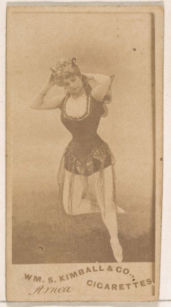 Curator: Look at this peculiar carte-de-visite: "Miss Stetson" from the "Actors and Actresses" series made by Allen & Ginter for Virginia Brights Cigarettes between 1885 and 1891. Editor: Oh, hello, Miss Stetson! She looks… theatrical, like she’s about to burst into song or perhaps start a playful brawl in a saloon. There’s something wonderfully performative about her posture, but melancholy at the same time, a yearning in her eyes, which contrasts dramatically with the playful, coquettish tilt of her head. I feel the energy! Curator: These cards, trading cards of a sort, offered consumers something more than just nicotine. Actresses, athletes, political figures - these images provided a glimpse into a world of celebrity, influencing aspirations and ideals. And yet it also commodifies celebrity. Editor: And not only celebrity, but… femininity? There's something intensely fetishized in the theatricality of the costume itself—all of these different pieces emphasizing form, silhouette and a fashionable feminine persona for an audience. Curator: Absolutely. We see corsetry used to achieve an hourglass figure; she is packaged. The gaze meets the viewers, but is also somehow distant, almost vacant. It becomes difficult to consider the sitter's personality as opposed to a constructed visual fantasy. Editor: Do you think that that vacancy could be purposeful? I wonder about the actress's personal resistance in representing herself or the character within such a rigid set of social roles. What if the supposed vacant affect is an actual void of participation? Curator: Fascinating to consider subversion there! Looking at the layers upon layers of artifice here, I also can't help but consider that she is actively selling tobacco and contributing to the addiction. She, of course, is beholden to these circumstances herself as an actress, I think the melancholy there then might indeed be profound. Editor: It's strange isn’t it, that even a century plus on from its making, this piece generates such complex feelings. From longing to disillusionment, and back again. Curator: A perfect, thought-provoking tension.