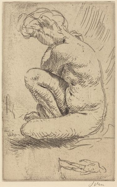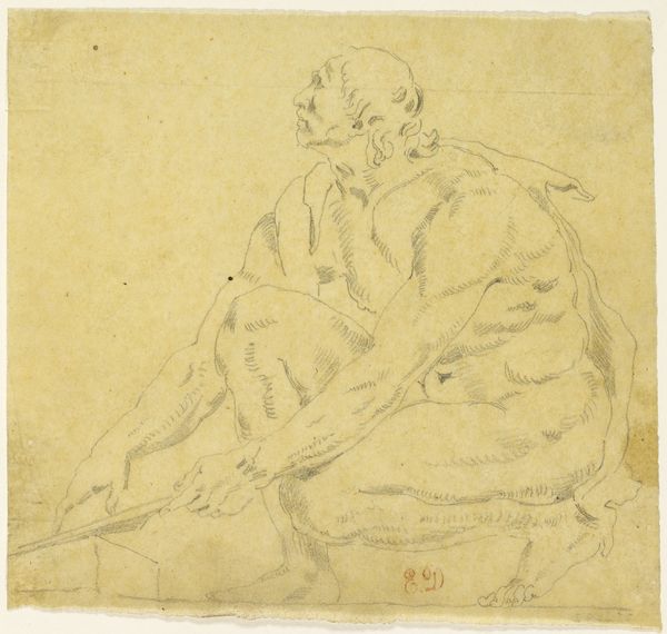 Jean-Antoine Watteau sketched this reclining nude figure in sanguine chalk, a medium prized for its warm, flesh-like tones, during the early 18th century. Watteau lived during the transition from the opulence of Louis XIV's reign to the more intimate and sensual aesthetic of the Regency. While Watteau's social mobility allowed him access to aristocratic circles, his art often depicted figures in moments of leisure and reverie, hinting at deeper emotional complexities. Nudity in art has historically been fraught with issues of gender and power, often objectifying the female form for a male gaze. However, Watteau’s choice to depict this figure with a sense of introspection allows the viewer to develop a more empathetic reading. The ambiguity inherent in the figure's posture invites us to consider the societal expectations placed upon bodies, then and now. Does this depiction challenge or reinforce traditional representations of the nude, and what does it evoke in us today?