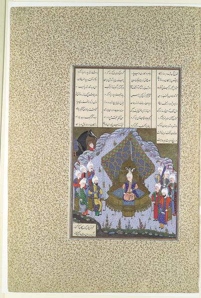 Editor: So, this tempera and textile work, "Untitled," comes to us from Mirza Agha Emami. It has the feel of a Persian miniature, doesn’t it? The colors are so vibrant, even within the aged aesthetic. What immediately jumps out at you? Curator: What I find compelling is the performative aspect presented in the setting. The miniature appears less as a private scene and more as a staged event within a broader cultural landscape. How do we consider the implied audience, both within the painting and those who later viewed this piece in galleries or private collections? The carefully detailed borders frame not just an image but also a constructed world. Editor: A constructed world, definitely! It feels so deliberately positioned. Do you think the location affects the interpretation? Curator: Absolutely. The location, whether intended for domestic display or courtly appreciation, dictates its socio-political function. Are we seeing a romanticized depiction of leisure meant to reinforce power structures, or a glimpse into a lived, albeit idealized, reality? The framing textile design itself suggests luxury, controlling and commanding the aesthetic experience. Does this framing manipulate the content and message? Editor: I hadn't considered how the medium is the message itself here. I was so caught up in the landscape painting within the textile design! Curator: Precisely. The placement of art is a deliberate choice. And thinking of the artist...I now feel there is more to uncover in later study of other works of this era.