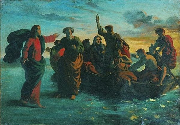 Editor: This oil on canvas, titled "Meeting of princess" by Fyodor Bronnikov, was painted in 1883. I find the composition incredibly compelling, with all the figures positioned across this horizontal plane of water. What strikes you most about this work? Curator: The use of color in differentiating the foreground and background is indeed remarkable. Notice how the artist employs a warm palette for the figures closest to us, their robes and faces rendered with meticulous detail. Conversely, the background figures are enveloped in a cooler, almost ethereal light. It seems to diminish them but in fact enhances the painting's sense of depth. Have you considered how Bronnikov’s brushwork contributes to the overall impact? Editor: I hadn't thought about it specifically. Now that you mention it, there’s a stark contrast. The details in the main figures, especially their garments, seem almost photographic, while the background appears softer. Curator: Precisely. This contrast, while potentially serving narrative purposes, simultaneously demonstrates a mastery of technique. Furthermore, consider the very subject—a meeting of royals upon water. The verticality of the figures contrasts sharply with the horizontal orientation of the composition. Editor: It’s a really subtle play between those elements! I see what you mean about the tension created. It adds dynamism. Curator: Indeed. By paying close attention to form, line, color and their tensions, we find meaning and expression—a profound aesthetic achievement, don’t you think? Editor: Absolutely! Focusing on the formal elements really brings a different understanding. Thank you for pointing all of that out. Curator: My pleasure. Approaching art with a formalist eye allows us to appreciate the artist's technical choices.