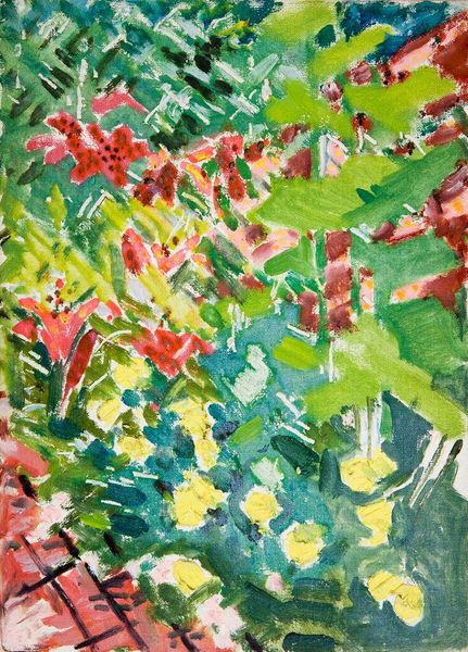Curator: At Harvard Art Museums, we have Denman Waldo Ross's "Garden," a small oil painting measuring about 35 by 25 centimeters. Editor: It's quite hazy, almost dreamlike. The layering of colors creates this sense of depth, but it is also obscuring. Curator: Yes, notice the brushwork, which is quite loose. Ross was deeply interested in the materials themselves, emphasizing the texture and application of paint. This connects him to broader debates around craft and artistic labor at the time. Editor: For me, this application generates a visual rhythm. The eye dances from the muted greens to the purples, almost like decoding a secret. Curator: And perhaps the "secret" is simply the act of seeing itself, the labor involved in truly observing a space. Editor: It leaves you contemplating the interplay between form and feeling, doesn't it? Curator: Exactly. It's a reminder that the value of art often lies in the processes of its making.