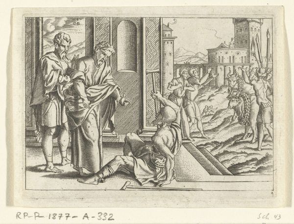 Curator: Hans Collaert the Younger, though we're unsure when he was born or died, brings us "Scene from the Life of Elisha." It’s currently housed at the Harvard Art Museums. Editor: What strikes me immediately is the sheer industry of the figures in the background, all reaping. It’s quite the contrast to the stillness of the foreground. Curator: Indeed. The print contrasts agricultural labor with domestic life, a world of toil against quiet intimacy. The sharp lines suggest an engraver’s dedication, each stroke deliberate. Editor: Look at how the work in the fields is depicted alongside the presentation of the sickly child. It gives an interesting commentary on the labor needed to sustain life and the fragility of life. Curator: I feel Collaert juxtaposes the mundane and the sacred, inviting us to contemplate the cyclical nature of life, death, and rebirth. Editor: Precisely, and perhaps also the economic and material conditions that shape those cycles. It’s a fascinating piece offering so much insight. Curator: A somber work, but one that inspires reflection.