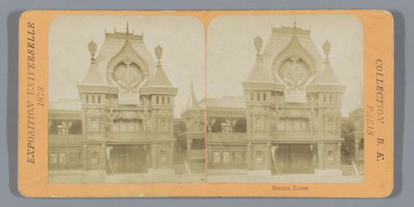 This stereoscopic image from 1878 captures the Russian Pavilion at the Exposition Universelle in Paris. The pavilion's architecture is striking, an assembly of pointed roofs and towers rising like a medieval fortress, echoing the historical might and cultural aspirations of Russia. The pointed arch, a dominant motif, is not merely an architectural element; it is a symbol laden with historical and cultural weight. We see this arch echoed in Gothic cathedrals, and even in the decorative motifs of Islamic architecture. These shapes are vessels for shared memories, expressing aspirations of transcendence. The same yearning for the heavens found in the Gothic period now manifested in this symbol of Russian identity. The pavilion itself, a temporary structure, embodies the cyclical nature of cultural expression. Like the masks of ancient rituals or the costumes of Carnival, it is a transient embodiment of deep-seated cultural narratives. It echoes in our collective consciousness, these forms speak to our shared history, resurfacing in various guises across time.
