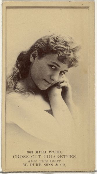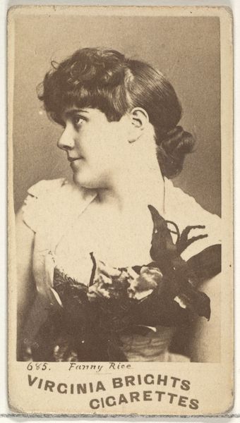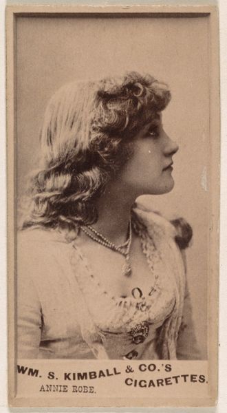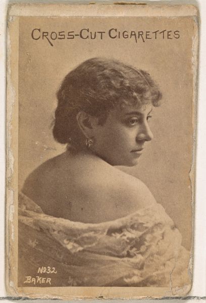 Curator: This is Card Number 8 from the "Actors and Actresses" series (N145-1), created by W. Duke, Sons & Co. in the 1880s. These cards were issued to promote Cross Cut Cigarettes and form a part of a broader phenomenon linking consumption, celebrity, and visual culture. Editor: The first thing that strikes me is the intimacy of it. It’s a sepia-toned profile, a young woman with a delicate cross necklace, gazing slightly downward. It feels like a stolen moment. There is something really sentimental about the soft details, and that direct connection of marketing, performance, and gender. Curator: Absolutely. The portrait drawing aesthetic evokes a sense of refinement, which ties into the way tobacco companies were then trying to market cigarettes. Note how the “Cross Cut Cigarettes” brand name at the top visually anchors the card and its cultural meaning. It shows us how imagery can be deployed to cultivate a desire around certain commodities. Editor: It’s also quite telling, I think, that actors and actresses were used as selling points. Their image becomes part of the product. The ideal of the 'actress'—her beauty, perceived talent, perceived social status—it’s all consumed along with the cigarette. She isn't really there as herself. She is literally on the packaging. Curator: Precisely. These cards weren't merely decorative, they circulated ideas about fame and beauty. The distribution method, included in cigarette packs, broadened access to images and helps us see how visual culture started seeping into everyday life. Think of it as a nascent form of today’s digital influencer culture, but rendered through print media. Editor: And the idea that women’s image, even with that overt cross necklace suggesting piety or virtue, could be essentially "bought" by the company really points to the objectification inherent in early marketing strategies, in the commodification of the artist's image. I find this both intriguing and disquieting. Curator: That uneasy tension between artistry and commerce is central to understanding this piece. Editor: Reflecting on it all, it becomes clear these cigarette cards offer a lens to analyze issues like gender roles, celebrity culture, and the marketing strategies of a bygone era that still have implications in our digital age. Curator: A truly perceptive point, prompting us to further scrutinize the hidden messages in images and their societal echoes that linger even now.