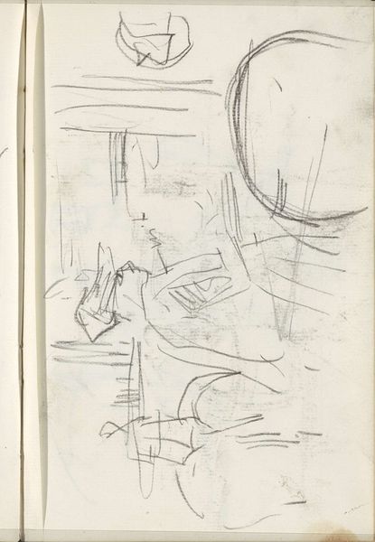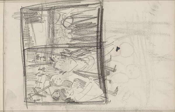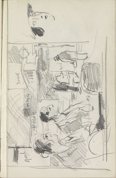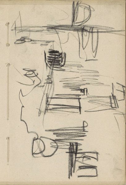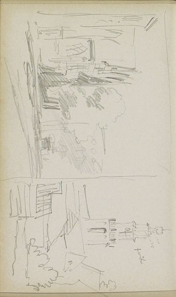 Curator: Before us is a work by Adrianus Eversen titled "Drie stadsgezichten," or "Three Cityscapes," rendered in pencil on paper, likely sometime between 1828 and 1897. Editor: There's an immediacy about these sketches, a quiet record. You get a sense of architectural shapes and suggested forms. The bareness speaks volumes; it's not a finished work but conveys a great deal of space. Curator: Eversen specialized in meticulously portraying Dutch city life during the 19th century. But it looks as though in these three pencil sketches, we see a rare glimpse into Eversen's process rather than the polished product for public consumption. This wasn't made for exhibition, of course; it likely comes from a sketchbook. I am curious to know if these streetscapes reflect a Netherlands wrestling with rapid urban and industrial transformation during that era. Editor: Definitely, there's the recognizable ghost of tradition mixed in with what was then "modernity," particularly visible through what look like public spaces like plazas. Those spaces may serve as icons of collective memory. Even the linear strokes imply structures that serve symbolic functions that go beyond the merely architectural. They hint at how cultural symbols become intertwined with city spaces to preserve meaning over long expanses of time. Curator: His finished paintings usually present bustling street scenes with market life, trade, and sometimes public works. I would hypothesize this shows that the visual strategies and even ideologies he used within public exhibitionary paintings were always preceded by smaller studies that capture how architecture shapes communal memory in Eversen’s imagination. This gives us an insight into the relationship between art making and memory construction at the popular level during his time. Editor: Looking again, the rapid lines almost evoke a dream-like impression, where specific architectural aspects begin to melt and blend. It underscores how deeply our perceptions of "place" are truly fluid and embedded within our interior psychological experiences. Curator: It seems in this raw, unfiltered state, these "Three Cityscapes" unveil Eversen's working processes as he interprets society. It's a great opportunity to analyze the relationship between art and memory at the societal level. Editor: I leave seeing beyond what I usually regard as objective physical matter within cities into an understanding of architectural presence and psychic landscape.