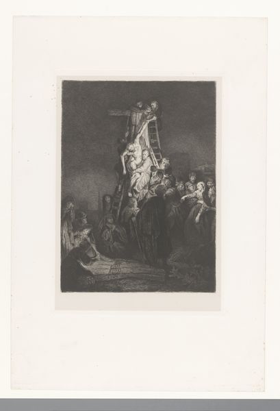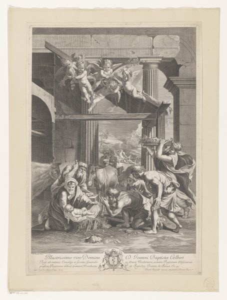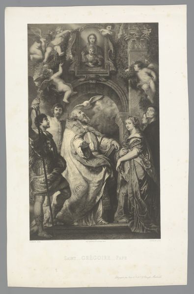 Richard Earlom created this mezzotint print, "Presentation of Christ in the Temple," during a time when religious art served as a powerful tool for cultural and moral instruction. Here, we see the infant Jesus presented in the temple, a scene laden with patriarchal and religious implications. Mary kneels, her posture a symbol of submission, while the high priest, adorned in elaborate robes, looms over her, representing the authority of the religious institution. Consider the power dynamics at play: Mary, a young mother, stands before a system that dictates her role and worth. The gaze of the surrounding figures, mostly male, further emphasizes this dynamic. Earlom’s print invites us to reflect on the historical and ongoing negotiation of women’s roles within religious and social structures. How do such images perpetuate or challenge traditional narratives of gender and power? It calls us to think about the emotional weight carried by those who find themselves at the intersection of faith, identity, and societal expectations.