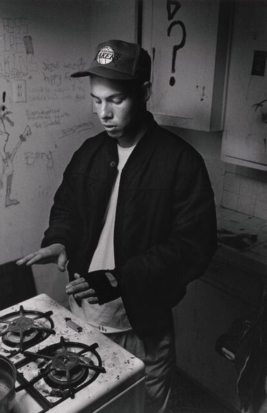 Curator: Rineke Dijkstra's "James. Tate Modern, London. 10 December 1999" presents a young man standing against a stark white backdrop. The dimensions are roughly 67 by 51 centimeters. Editor: There's a compelling stillness, despite the visual noise of the paint splatters on his clothes. It's quite arresting. Curator: Dijkstra often focuses on individuals at transitional moments. This image encapsulates the sitter's role within the museum, a painter caught between labor and display. Editor: The plain background emphasizes the subject's vulnerability, foregrounding him as an object of scrutiny within the institution. Curator: Consider the formal symmetry – the central figure, the balance of colors. The paint acts as an abstract expressionist counterpoint to the realism of the portrait. Editor: It’s a fascinating blend of representation and societal commentary, isn't it? One that makes you think about the role of the working class within the museum. Curator: Indeed, it prompts a reevaluation of both the aesthetic and the societal frameworks at play.