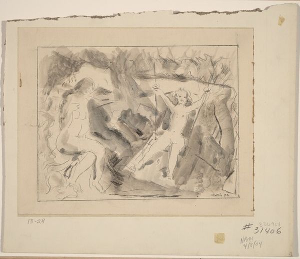 Curator: This is a sketch by Albert Neuhuys, titled "Zittende figuren en twee kinderen in een interieur," placing seated figures and two children in an interior. It's rendered with pencil and ink on toned paper. Editor: There's a stark vulnerability to this. It almost feels like a fleeting memory caught on paper; very rough and incomplete. Curator: Exactly. Given Neuhuys’ body of work which often depicts the daily lives of rural Dutch families, it gives a window into 19th-century social structures, especially the roles of women and children in the household economy. The sketchbook context reframes what we typically see in genre painting; it's rawer. Editor: It definitely strips away the romantic idealization. Look at the way the figures are sketched; so quickly, with such direct, almost crude lines. There's nothing precious about the materials either. It feels very process-oriented, showing how observation becomes translated through hand and pencil, and its function of production in a studio. Curator: This aesthetic aligns, perhaps, with Impressionism in its focus on the immediate impression, prioritizing fleeting observation over polished finish. Think of the implications of Neuhuys documenting marginalized communities. It can be powerful when their experiences become more visible within the larger cultural dialogue of the time. Editor: Absolutely, this challenges the idea of "high art" when considering its labor. The labor of depiction becomes laid bare and we are confronting Neuhuys’ work directly. Curator: True. A piece like this calls attention to issues of class and representation, both then and now. Editor: Precisely, these quickly rendered impressions resonate beyond its period. By exploring the making of art through humbler materials, it democratizes our engagement with art making and reminds us to focus on art-making as a practice. Curator: This type of sketch can offer profound entry points to engage with its artistic, social, and political meaning, as well as what the practice entails in relationship to gender, labour and class in a new manner. Editor: It shifts from solely being art in terms of aesthetics towards process and production, I’ll leave with that sentiment.