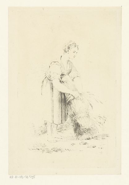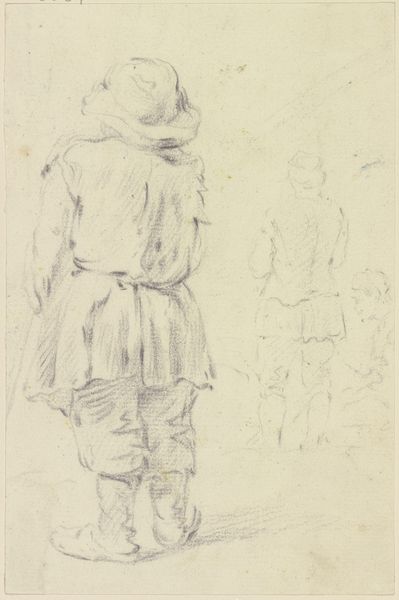 Georg Melchior Kraus created this drawing of an old woman with a basket and a young girl using graphite on paper. The artist’s hand is evident in the quick, gestural lines that define the figures, capturing a fleeting moment. The softness of graphite allows for subtle gradations of tone, creating a sense of volume and depth. Kraus skillfully uses hatching and cross-hatching to model the forms, adding texture to their clothing and hair. The deliberate choice of graphite and paper allows for a direct, intimate engagement with the subject. It is a humble medium, and in this case, beautifully suited to the scene. The use of drawing to capture observations of everyday life elevated the importance of craft and sketching as essential skills for artists. By focusing on the lives of ordinary people, Kraus's drawing reflects a broader cultural interest in the lives of the working class. It is through this lens of making, material, and social context that we can fully appreciate the depth and complexity of this simple sketch.