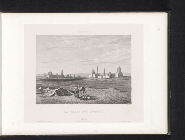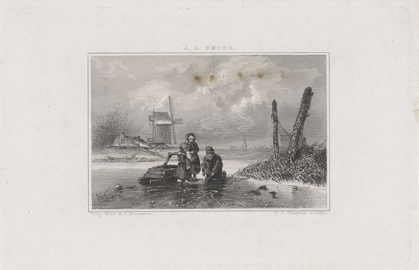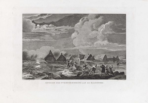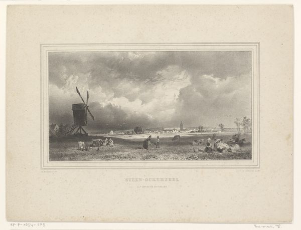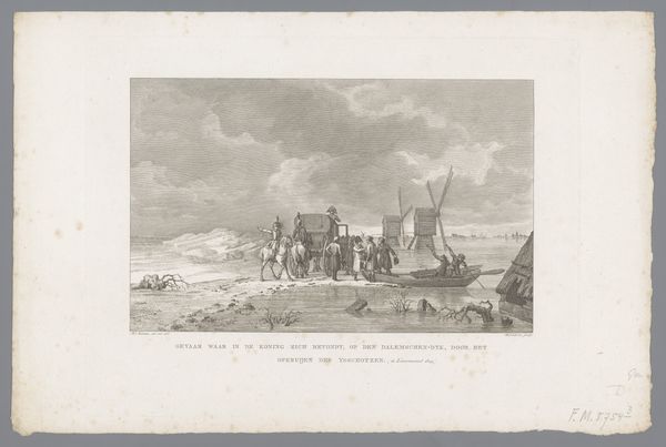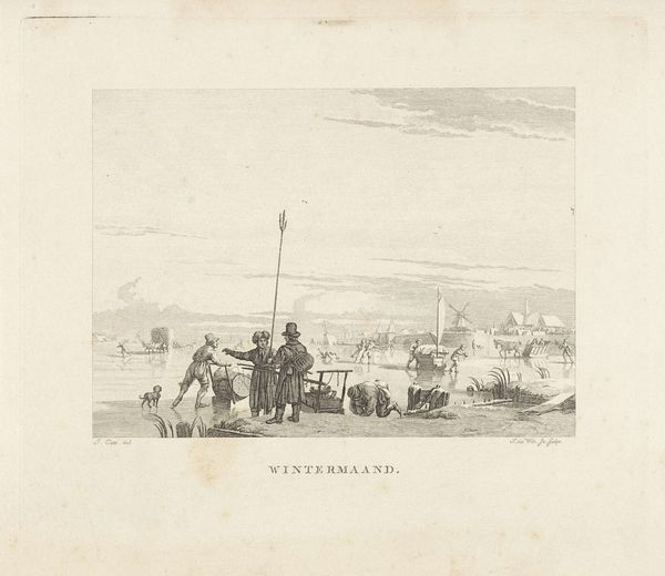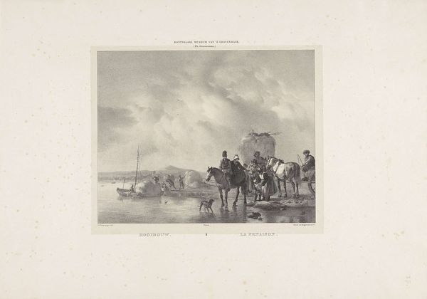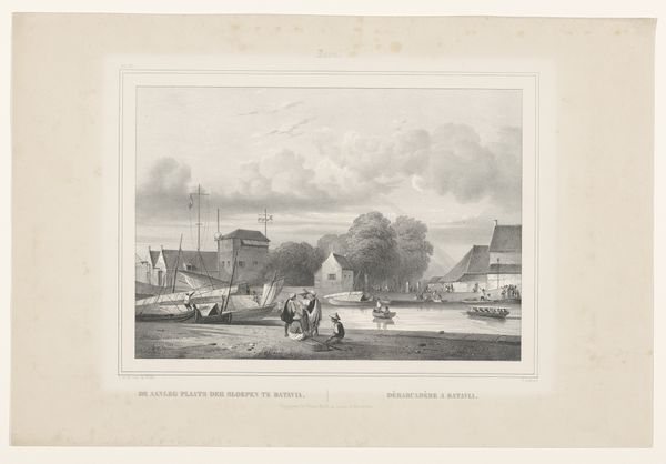 Editor: Here we have Gijsbertus Craeyvanger's "Strandgezicht," created in 1833 using pencil and drawing techniques. There's a somber quality to it, given the muted tones and focus on the everyday life of people by the sea. The way he captures light feels very deliberate. How do you interpret this work through a formalist lens? Curator: Well, first, let us consider the tonal range of the composition. Craeyvanger uses a limited palette to create depth through subtle shifts in value, from the luminous sky to the darker figures huddled near the tent. What do you observe about the arrangement of forms and shapes within the picture plane? Editor: The people grouped on the left and the activity receding into the distance on the right seem to create a balance, almost like a visual see-saw, drawing the eye through the scene. Curator: Precisely. Note also the rhythmic interplay of vertical elements, such as the tent pole and the distant masts of ships, contrasted by the strong horizontal line of the shoreline. This repetition of forms, echoing through the artwork, underscores the relationship between nature and humanity within the piece. The artist uses careful strokes of the pencil. The rough lines of the hut, and the softer lines in the clouds. What's your reaction? Editor: It all feels very controlled. And it focuses my attention not just on the subject matter but also the careful artistic choices within the frame. Thank you! Curator: A close analysis rewards us with such insights.