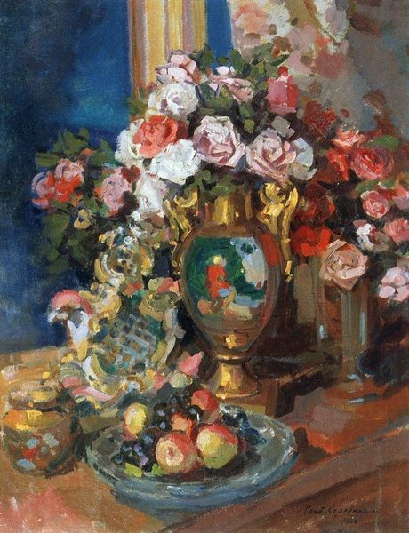 Konstantin Alexeevich Korovin created this still life, titled 'A Bouquet of Paper Roses,' using oil on canvas. The rose, prominently displayed, is laden with symbolism. From ancient Greece, where it was associated with Aphrodite, to its later adoption as a symbol of the Virgin Mary, the rose has represented love, beauty, and even transience. Notice, however, that these are paper roses. What does it mean when a symbol of love and beauty is rendered in an artificial, impermanent material? The paper rose evokes a sense of imitation, and the ephemeral nature of beauty. This recalls the vanitas paintings of the Dutch Golden Age, where flowers symbolized the fleeting nature of life. Consider how collective memory shapes our interpretation, how these motifs recur in art across time and space, evolving with each iteration, yet retaining a connection to their origins. Korovin plays with these visual cues to evoke a deeper emotional response.