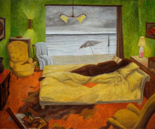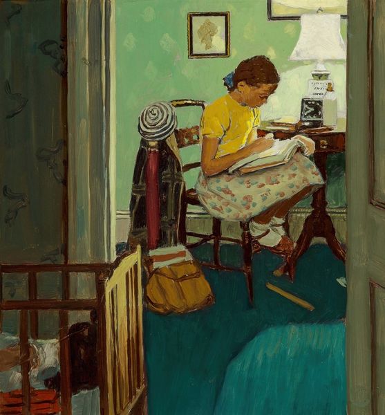 Curator: William Ratcliffe's "Attic Room" presents us with an intimate domestic space, rendered in a square format that emphasizes its enclosed nature. Editor: It feels melancholic, doesn't it? The floral wallpaper, the sparse furnishings... there's a palpable sense of solitude, maybe even confinement, that resonates with historical notions of women's roles in domestic settings. Curator: The geometric structure of the room is quite striking. Note how Ratcliffe uses the angles of the ceiling to create dynamic lines that converge and diverge, disrupting any sense of conventional perspective. Editor: Absolutely, and it’s hard to ignore the socio-economic implications here. Attics are historically spaces relegated to those of lower status. Ratcliffe's choice invites us to consider narratives of class, labor, and the unseen realities of domestic service. Curator: The composition, with its subtle interplay of light and shadow, draws attention to the formal qualities. The textures of the rug, the wood, and the wallpaper create a rich visual experience. Editor: I see it as a commentary on the stifling nature of domesticity. The jug, isolated on the floor, becomes a symbol of unrealized potential, reflecting a woman’s confined existence. Curator: It's a beautifully balanced, albeit asymmetrical, arrangement. Editor: Yes, and that off-kilter balance perhaps highlights the inequities of the space.