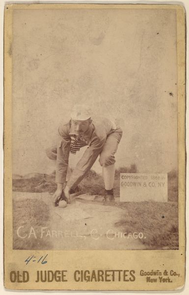 Curator: This fascinating piece is a baseball card from 1888, titled "Jim Devlin, Pitcher, St. Louis Browns," part of the Old Judge Cigarettes series by Goodwin & Company. It captures a posed shot of Devlin, a pitcher, in a rather unusual stance. Editor: My first impression is…peculiar. It's awkward and intriguing all at once. The high leg, the prone position; it's a far cry from the dynamic action shots we often see. Curator: Exactly. We have to consider the historical context. These cards weren't just about baseball; they were about commerce, about selling cigarettes, and about projecting an image of idealized athleticism. Devlin is posed heroically, but within constraints – likely designed to fit the dimensions of the card and, of course, the era’s sensibilities. Editor: And what about the composition itself? The earth-toned palette lends it a vintage feel. He seems firmly grounded, emphasized by that striking line he creates from his foot right through the placement of his body along that center line of the work. There's definitely an intention behind the arrangement of his limbs, as well as the blank board and sign in the background. It gives it all the staged performance appeal so common in historical portraiture. Curator: I would agree with you to an extent on it having all the characteristics of a portrait, though its distribution channels suggest anything but elite status. The use of these cards – inserted into cigarette packs – placed the image within a very accessible, almost democratic sphere of visual culture. Think about what this kind of proliferation achieves: it helps shape the popular perception of the sport and its players. Devlin wasn't just a player; he was a commodity, a signifier within a system of consumerism. Editor: Do you see any indication in this of how sports or entertainment might impact on societal or individual gender expectations, biases, or norms? The work as a whole, after all, shows a lot of physicality. Curator: Definitely. Sports, like baseball, were strongly tied to notions of masculinity, health, and strength in late 19th-century America. In showing men and their sporting prowess in advertisements it may have shaped expectations for the sporting roles or abilities of men and people. Editor: It is quite incredible. I came into it merely judging by surface. You've helped me see how it's layered with complex cultural and economic meanings beyond its seemingly simple subject matter. Curator: It’s a fascinating reminder that even seemingly straightforward images are deeply embedded within broader societal structures of power, representation, and commodification. It shows us much more than it seems.