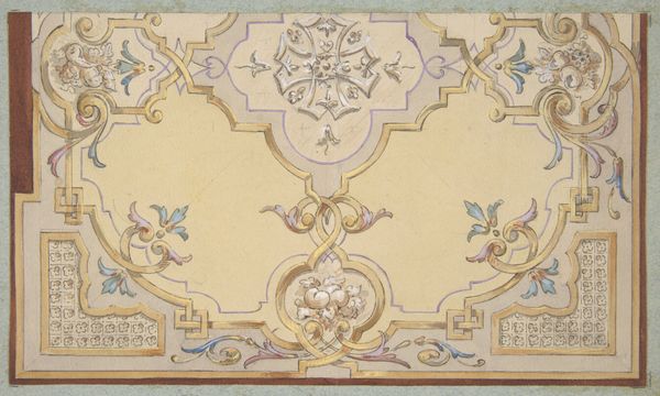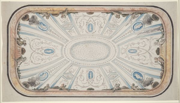 Editor: Here we have François Joseph Bélanger’s "Study for a Ceiling of a Salon in the Hôtel de Mazarin," made sometime between 1760 and 1818. It’s a drawing, a print, and possibly related to fresco, showing a highly ornamented ceiling design. It strikes me as incredibly elaborate, yet delicate, with a dreamlike quality. What catches your eye in this piece? Curator: Oh, you’ve touched on something essential. For me, it whispers of grand ambitions and lost worlds. The Neoclassical period, you know, was so enthralled with revisiting antiquity. Here, you see the architect trying to capture the ethereal nature of frescos on paper. What do you make of all the geometric forms versus the natural ones like the clouds or cherubs? Editor: Well, I see how the strict geometry provides a kind of framework, maybe to contain, or even elevate, the more whimsical, flowing elements? Like a cage for dreams? Curator: "A cage for dreams," I like that. Absolutely! Consider that for patrons in that time, the ceiling would literally look down on them in that room—asserting ideals of harmony and order. It's like they wanted to think and socialize under a perfect version of the world, quite literally, a "ceiling" to their own earthly desires. Doesn't it make you wonder about the conversations that might have unfolded beneath it? Editor: Definitely. Thinking about those past conversations almost brings the drawing to life, it makes history feel a little more intimate, and relatable. Thanks, I’ll never look at ceiling art the same way. Curator: And I will be dreaming of "cages for dreams," wonderful. I guess art history is, ultimately, about conversations, don’t you think? With the past, and with each other.