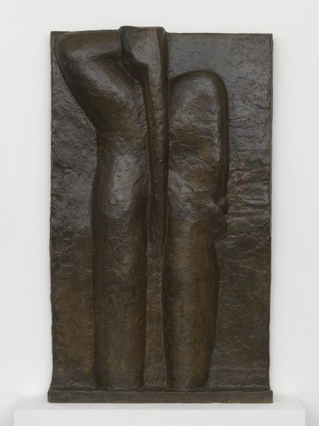 Curator: Kenneth Armitage's "Square Figure Relief" presents us with a fascinating study in form and texture. The artist, who lived from 1916 to 2002, has rendered a striking portrait through this cast relief. Editor: The first thing that strikes me is its monumental presence despite its moderate scale; the rough surface gives it an almost ancient, weathered feel. Curator: Indeed, the roughness is key. Considering Armitage's context—post-war Britain—this work can be interpreted as grappling with the aftermath of conflict and the reshaping of identity. The abstracted face pushes back against traditional ideals. Editor: I see it as an emblem of resilience. The squared-off features, the way the light catches the high points—it speaks to the enduring human spirit, shaped by circumstance. It evokes a sense of ritual and something deeply rooted. Curator: Precisely, and that resonance is enhanced through Armitage's exploration of material and form, which he uses to confront complex socio-political realities. Editor: It leaves you pondering the stories embedded within its texture. Curator: A potent reminder of the individual within broader cultural shifts. Editor: Very well said.