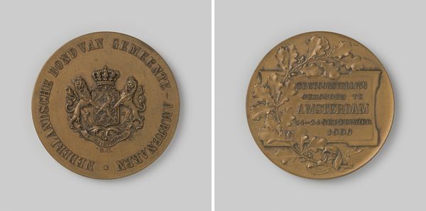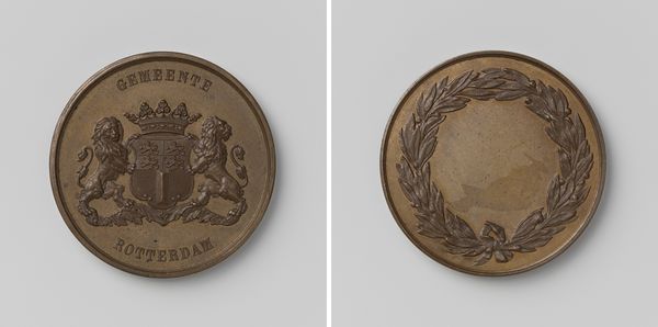 This bronze medal was designed by Tjeerd Keikes, a Dutch artist, in the 19th century. It commemorates the "Vriesch Genootschap van Proefondervindelijken Landbouw", a Frisian society dedicated to experimental agriculture. The medal's imagery provides a fascinating window into the values of agrarian society in the Netherlands at that time. The prominent depiction of livestock suggests the importance of animal husbandry. The society's name inscribed around the image of the cow emphasizes empirical methods and scientific thinking. The blank space surrounded by a laurel wreath on the reverse side seems to denote the pursuit of knowledge and achievement through agriculture. To fully understand this medal, we might turn to archival records of the society itself, agricultural journals of the time, and economic histories of the Netherlands. Through such resources, we can begin to see how art like this reflects and shapes social values, economic conditions, and institutional agendas. Ultimately, this medal serves as a reminder that art is always embedded in specific historical contexts.