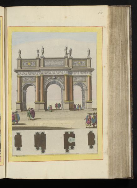 Curator: Here we have a drawing, dating back to the early 1700s, whose creator we don't know. It depicts the armory inside the Bastille in Paris. Editor: The linear perspective and overall symmetry are immediately striking. The architecture is carefully delineated, but the color palette lends a certain charm and prevents it from feeling too severe. Curator: Indeed, that tension is quite palpable when considering that the Bastille wasn't merely a storage depot. It served as a prison and became a symbol of oppression and, eventually, revolution. Seeing the orderly arrangement of weapons alongside these figures, all meticulously documented, reminds us of the institutional power dynamics at play. Editor: Absolutely. Looking at how space is rendered here, you see the careful organization, almost like a stage. Note the repetition of the weapon racks and their precise placement, each one contributing to an imposing and regulated feel. The artist seems less concerned with individual expression and more focused on presenting a clear image of structured power. Curator: The presence of people in the armory suggests a working environment, though the uniformity in dress and lack of individual details reinforces their place within a hierarchy. Were these men even meant to be seen as individuals? Or are they rather cogs in a massive machine? The weaponry stored here ultimately fueled colonial ambitions. Editor: And while we're delving into these power structures, one can see it reflected in the composition too: note the horizontal lines of shelves extending to vanishing point and balanced by verticals of classical architectural structures—all communicating stability and order. This control that the artist asserts through organization gives one an emotional satisfaction beyond representing literal fact. Curator: Examining it through a critical lens invites conversations about not only governance but representation itself—who has the authority to document history, and what narratives are intentionally amplified or silenced? The drawing functions as both a visual document and a sociopolitical artifact reflecting 18th-century sensibilities. Editor: Thinking along these lines, the appeal stems from that calculated balance—the artist creates an organized space but retains painterly looseness in execution... Curator: Precisely! An engagement with context is essential to grasp the layers. It shows an environment used as the launchpad for the mechanisms of early capital. Editor: A fitting reminder of how artworks speak volumes, revealing truths beneath even seemingly simple surfaces, however.