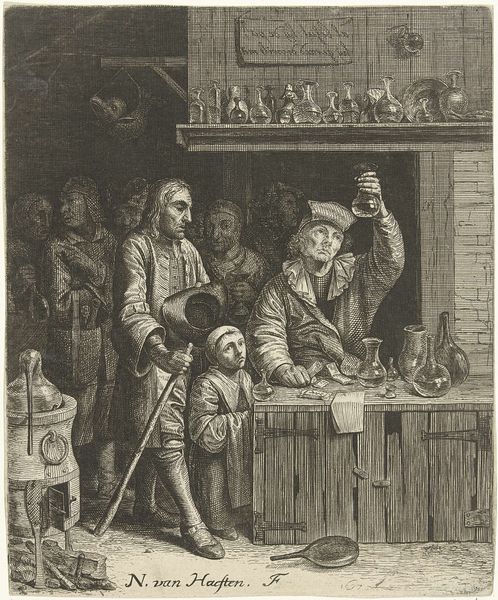 Editor: This is Honoré Daumier’s "You see here the great celebrities," an undated lithograph from Harvard Art Museums. It's a bustling scene, seemingly satirical. What can you tell me about Daumier’s process and the materials he employed here? Curator: Daumier's lithographs gained popularity due to the accessibility and reproducibility of the medium, allowing mass consumption of his social critiques. How do you think this ease of production influenced his commentary on French society? Editor: I suppose it allowed his critical views to spread rapidly. Curator: Precisely. Lithography enabled Daumier to engage with a wider audience, blurring the lines between fine art and popular media. It also let him challenge power structures more directly, by critiquing the elites. How does that impact our perception of the work today? Editor: It highlights the relationship between art, labor, and social change. Thanks! Curator: Indeed. It shows how material conditions shape artistic expression and meaning.
