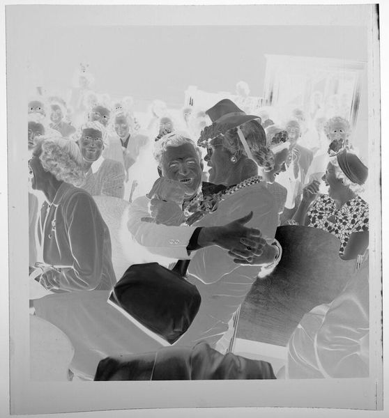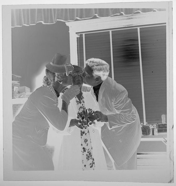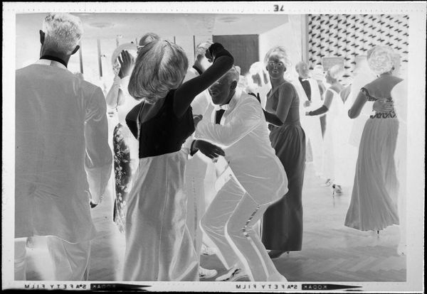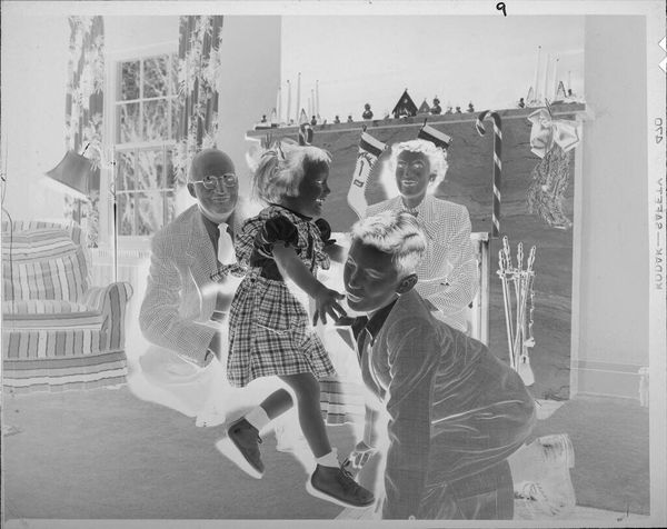 Editor: This is an untitled photograph by Jack Gould, showing a couple seated on chairs. The stark contrast and negative image give it a somewhat eerie feel. What strikes you about this work? Curator: I’m drawn to the chairs themselves, and the labor involved in their production. Were they mass-produced, or crafted individually? The social context of leisure, suggested by the couple, contrasts with the often-unseen labor behind these commonplace objects. What does their pose tell us about consumption? Editor: That's a perspective I hadn't considered. Thinking about the labor really changes my reading of the image. Curator: Indeed. The image invites us to look beyond the surface and consider the full material and social story.