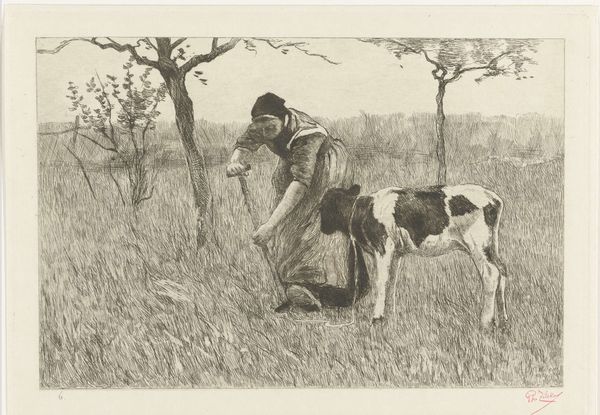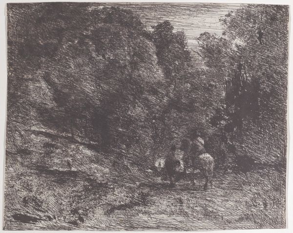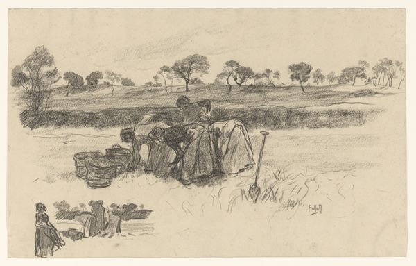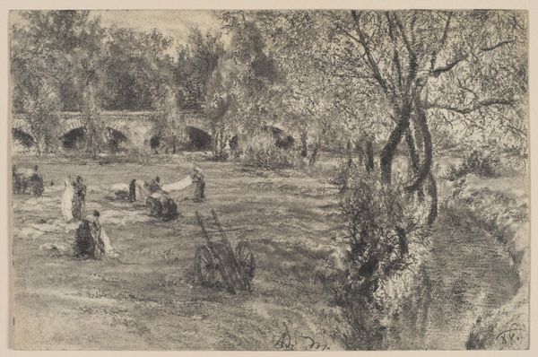Léon Augustin Lhermitte created this etching titled "Spring," capturing a pastoral scene of figures in a blossoming orchard. The blooming trees are not merely decorative; they are potent symbols deeply rooted in cultural memory. Throughout history, the image of blossoming trees has been connected with renewal, fertility, and the cyclical nature of life. We see echoes of this in Botticelli's "Primavera," where the orchard symbolizes a rebirth of nature and, allegorically, of the human spirit. Yet, here, Lhermitte strips away the overt mythological references, presenting a more grounded, quotidian vision. But these archetypes don't die easily; even in this understated scene, the burgeoning trees, laden with blossoms, speak to our collective subconscious. They evoke a sense of hope and anticipation. This is a motif that resurfaces time and again, each time subtly reshaped by the cultural currents of its era. We might call it the "pathos formula" of rebirth, constantly evolving and re-emerging through our shared human experience.