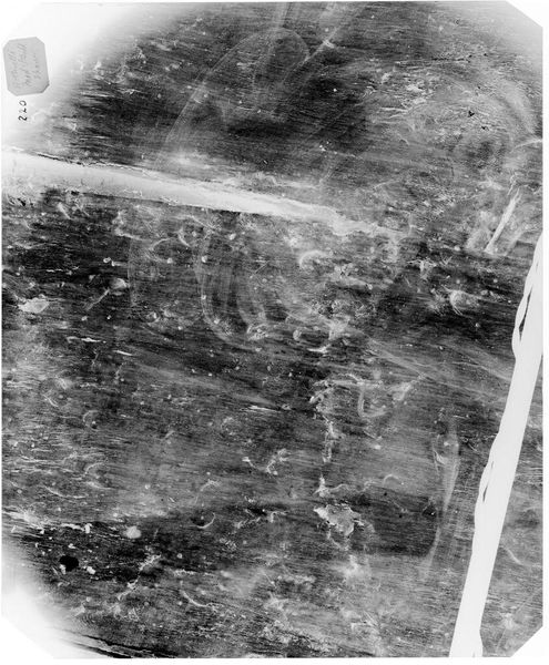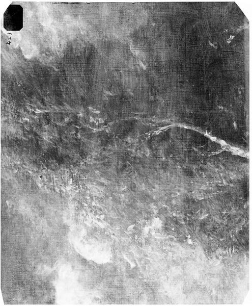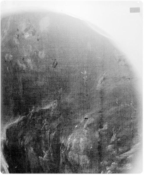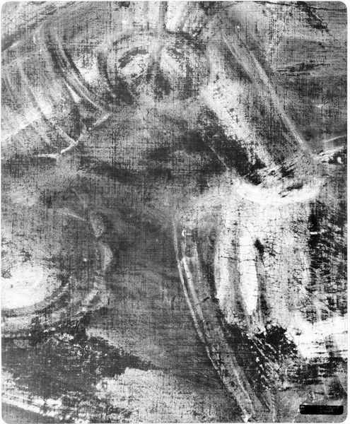 Editor: Here we have an X-radiograph of a fragment of "Bishop and Man in Adoration," possibly by Titian. The cracks and texture are fascinating. What can you tell me about this piece? Curator: This x-ray reveals more than just surface imagery. Consider it evidence of the artist’s process—the layers of paint, the underdrawing, the very materiality that constitutes the artwork. Where does “art” reside if not in these material processes? Editor: That's a perspective I hadn't considered. I was so focused on the image itself. Curator: Precisely. This challenges the traditional separation between high art and the labor involved in its creation. It's about more than just the artist's hand; it's about the material history embedded within. Editor: So, by understanding the materials, we understand more about the art itself? Curator: Exactly. We see the making of art as a tangible, material act. Editor: Thank you, this new perspective is something I'll remember.