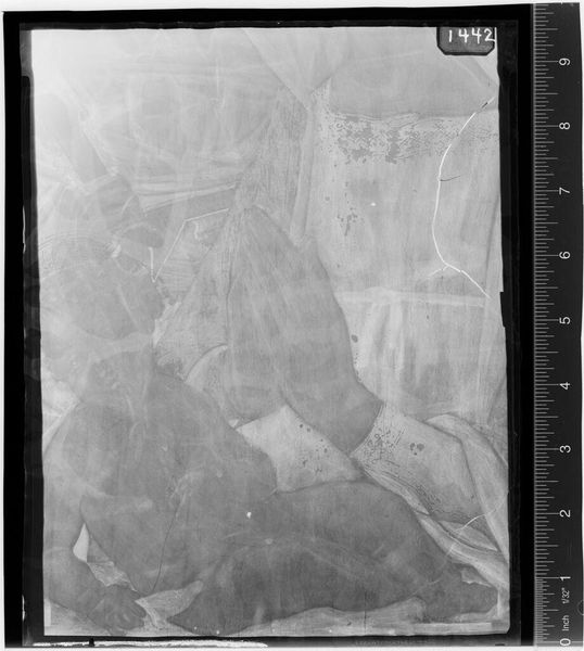 Editor: Here we have an X-radiograph of "Judith with the Head of Holofernes" after Andrea Mantegna. It's eerie seeing the painting like this. What stands out to you? Curator: The X-ray unveils the material construction and painting process. Consider the labor embedded in each layer of pigment, each brushstroke. Editor: So, what does this tell us about the production? Curator: It shifts the focus from artistic genius to the collaborative workshop, revealing the economic and social conditions underpinning its creation. Editor: That's fascinating. I'll never look at paintings the same way again! Curator: Indeed. It's not just about the image; it's about the physical object and its journey through time and labor.