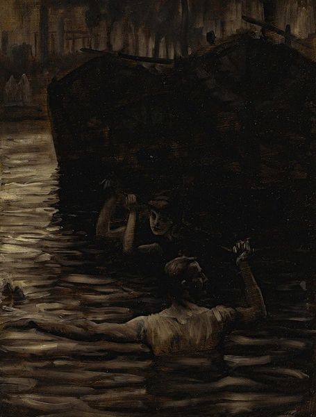 Curator: This oil on canvas piece from 1889 by Carl Locher, titled "Frederik VII's ligfærd d. 2. december 1863," depicts a somber scene in Copenhagen. It currently resides here at the SMK, Statens Museum for Kunst. Editor: Wow, immediately I feel like I'm wading through a dream—a sorrowful one, at that. It’s dark, almost oppressive, yet those flickering lights offer a melancholic beauty. Is it just me, or does it feel like a visual elegy? Curator: Precisely! The artwork captures the funeral procession of King Frederik VII by boat. Locher masterfully employs the Romantic and Impressionist styles to amplify the emotional gravity of the event, imbuing the cityscape with an aura of grief. Editor: You can really sense the convergence of styles. The almost photographic capture of the scene juxtaposed with the visible brushstrokes feels very modern. It's like the artist is showing us both the event and his feeling of the event simultaneously. And all those dark purples—deliciously dramatic! Do you know why he chose that particular vantage point, just on the water like that? Curator: Well, the water serves as both a reflecting surface and a metaphor. It mirrors the city lights, yes, but it also hints at the transience of life, and the passage from one state to another— mirroring death itself. Remember, water imagery was crucial in Romantic era meditations. By the way, observe how the glazes soften the light creating almost shimmering highlights that stand out in the somber atmosphere. Editor: Fascinating! It is an unexpectedly evocative piece, isn't it? Initially, I was consumed by the work's shadowy quality. But I am starting to think it’s actually Locher's command of light that truly commands attention, capturing it to make us feel how permanent yet delicate human experience truly is. Curator: Indeed. Through his sensitive use of color, texture, and light, Carl Locher transports us to that poignant moment in Copenhagen's history, allowing us to contemplate themes of loss, memory, and the shared human experience.