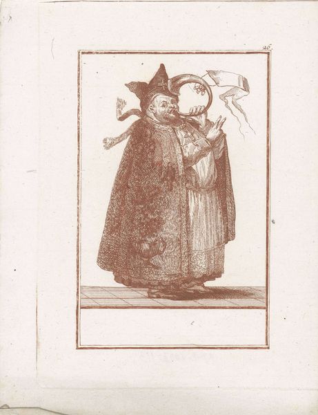 Curator: Here we have a look at "Monnik met vuur in de ene, water in de andere hand", an engraving made in 1724 by Jacob Gole, currently housed here at the Rijksmuseum. What strikes you first? Editor: It’s the immediate visual opposition, obviously. This monk figure simultaneously holding fire and water! The contrasting elements really create an air of tense mystery, wouldn’t you say? A study in symbolic contradictions, definitely, but… on what basis? Curator: Well, given it’s an engraving, the process would have started with a metal plate, likely copper, carefully etched with lines to create the image we see printed on this toned paper. Gole, being a renowned engraver, probably used various burins to achieve that precise detailing we see in the monk's robe and facial features. Note the specific way he articulated the face...the details indicate time invested in the labor. Editor: Right. It does have an immediate narrative pull! But the real key to understanding the piece lies in understanding the meaning imbued into those opposed elemental symbols, surely? The fire could represent purification, divine light, or even the fires of hell, while water speaks to baptism, cleansing, or the chaos of emotions. The character looks, for want of a better phrase, decidedly weird! Is this the artist’s interpretation of mental torment, or even duality of purpose? Curator: Consider also the socioeconomic context. In the Baroque era, printmaking like this allowed for relatively inexpensive reproduction of images, disseminating ideas widely. This image might have served as a satirical commentary on religious hypocrisy. Think about that contrast! Gole worked with the reproductive press extensively, so this suggests to me that the labor needed to complete this may be a form of critique or a vehicle of social message to those with whom he was circulating this print. Editor: Oh, certainly. And don’t forget the lasting cultural impact of alchemy too. Balancing opposing forces to achieve some kind of elevated knowledge or personal growth. Perhaps the figure embodies humanity struggling with inner conflict...torn between earthly passions (fire) and spiritual yearning (water). I would need to investigate that area. Curator: Ultimately, understanding Gole's working practices and the role printmaking had in Baroque society allows us a more tangible way to ground such symbolic speculations. Editor: Precisely! And viewing those elemental symbols, charged as they are, helps enrich and root our comprehension of not only Baroque period works, but our own personal understandings of human conditions too. Thank you. Curator: Indeed. The materiality meeting metaphor can certainly offer us further contextual and symbolic depths to these elements, that is without question!