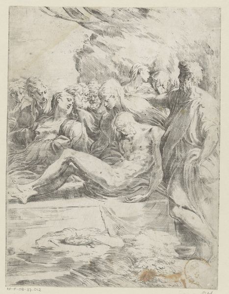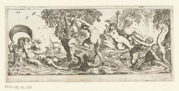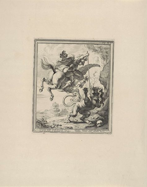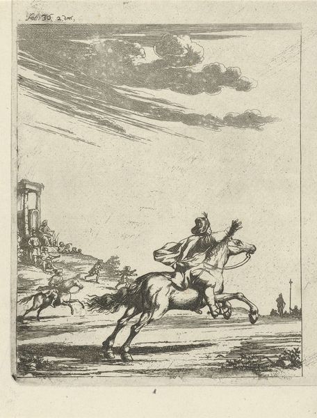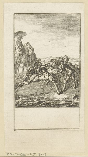 Curator: Let's talk about "Orlando en zijn gevechtspartner raken te water" by Louis Wilhelm Chodowiecki, made around 1771-1772. It's an engraving, so a print, showcasing quite a dramatic scene. Editor: Indeed. At first glance, it feels quite chaotic, yet there is this weird serenity about it; especially with the elegant figure on the horse contrasting the struggling man in the water below. It really draws your eye in and then quickly pulls it down. Curator: Chodowiecki worked primarily as an engraver. Given that he provided illustrations for popular novels and magazines, and catered to middle-class audiences, his works can be analyzed through the lens of accessibility. Engraving made art available to a wider segment of society. Editor: Interesting perspective. If we consider only its aesthetic properties, the stark contrast between the still rider, horse, and the turbulence below create an amazing pictorial dynamic. Chodowiecki masterfully manipulates line to convey both the rigidity of the architecture on the upper left, and the dynamic flow of the water. Curator: The engraving technique itself contributes to the narrative. Each etched line involved human labor, connecting to wider systems of production and the consumption of visual media during the late 18th century. These were produced and circulated in multiples for wide dissemination. Editor: You are completely right. Although that can easily be ignored at first due to how simple the line art makes the work feel on the surface, no pun intended, because there is a lot more below than what you can easily see. The work's balance and harmony are quite remarkable, no matter how its components may contrast one another. Curator: So we can observe here the distribution methods enabled by the printmaking medium helped to disseminate imagery, fostering social narratives. This has strong relevance and ties to modern-day social and mass media, as this kind of media creates and defines ideas in societies. Editor: Yes. Analyzing the material and production aspects allows for insights on how images were consumed and used to shape the perception of audiences from all social classes. Thank you for contextualizing this complex but rewarding work. Curator: Of course. Examining production provides very useful context for interpreting the aesthetics.