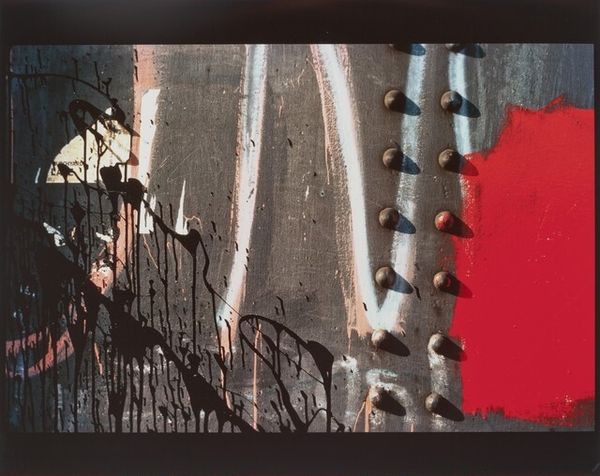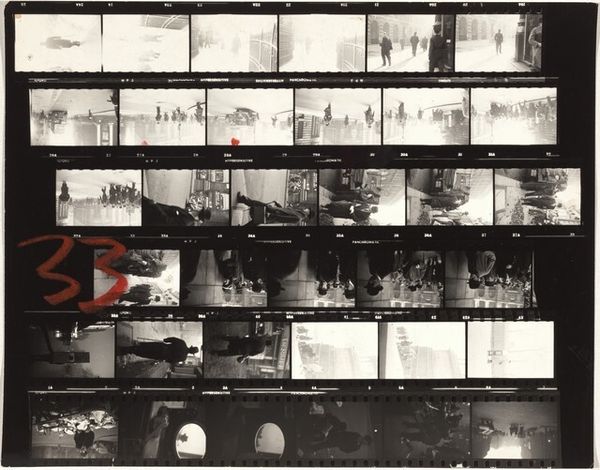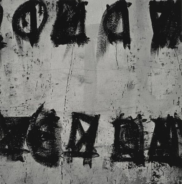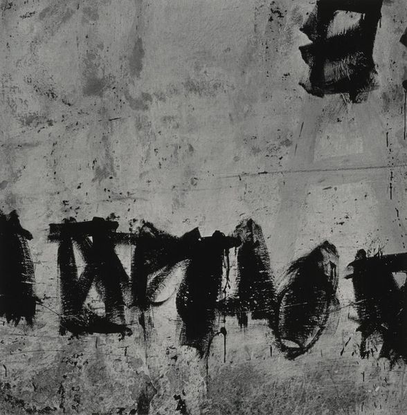 Editor: Aaron Siskind's "St. Louis 9," a gelatin silver print from 1955, presents this fascinating arrangement of abstract shapes and lettering in monochrome. It's kind of gritty and textural; almost like looking at a weathered wall. I’m curious – what do you see in this piece? Curator: Well, I’m immediately drawn to the conversation between chaos and control. Siskind finds beauty in the decay of urban surfaces. I love that he's not staging anything, simply *finding* these compositions. The peeling posters, the random markings – it's all pure accident, right? – yet he frames it with such intent that it feels deliberate, intentional. Almost like street poetry. What do you make of the letterforms scattered throughout the image? Editor: They remind me of early experiments with typography in painting. The 'O' and 'P' sort of ground the abstraction, make it almost recognizable, and tease my brain, trying to read something. It keeps it from being purely abstract. Does it remind you of Abstract Expressionism? Curator: Absolutely! He’s taking cues from Abstract Expressionist painters like Franz Kline but finding his action in the real world rather than inventing it on canvas. Siskind believed in the expressive potential of the mundane. Have you considered what this represents about postwar urban life? All the layers and signs... Editor: No, I hadn’t considered that…So, it's almost like a time capsule of urban visual culture, transformed into abstract art? I initially just saw it formally. Curator: Exactly. These weren’t merely documentary shots for him. He elevates the street into the spiritual. He isn't just recording what's there, but creating something entirely new out of it. What does "St Louis 9" mean, anyway? Hmmm, perhaps more questions than answers… Editor: Thinking about Siskind’s process – finding art rather than creating it – completely shifts my understanding. It opens up new avenues for thinking about photography and abstract art.