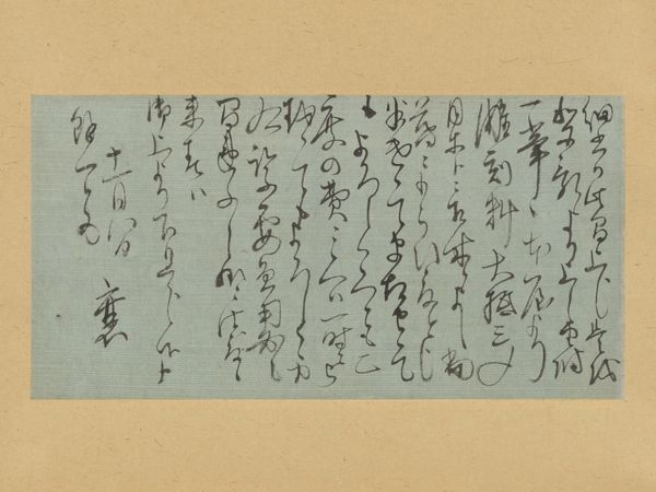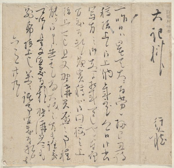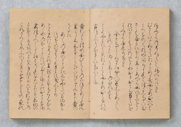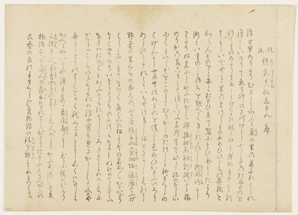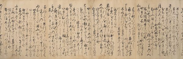 Curator: Here we have an exquisite example of medieval Japanese calligraphy: "New Collection of Ancient and Modern Poems," or "Shin Kokin Wakashū," dating back to the mid-14th century, now residing here at the Minneapolis Institute of Art. Editor: My initial impression is one of disciplined chaos. The inky characters dance across the aged paper. There's an inherent rhythm despite not being able to read a word of it. Curator: It is precisely this formal interplay that captivates! Note the elegant contrast between the dense, compact ideograms and the generous negative space surrounding them. The brushstrokes vary in thickness and pressure, creating a visual symphony of dark and light. Editor: I wonder who had access to poetry and literary art during this time, and if gender or other identity played a significant role? Whose voices are included, and whose are excluded from this collection? I wonder who owned or commissioned the work. It feels exclusionary to see what is probably important cultural content behind a wall of indecipherability. Curator: Such questions push us to consider the socio-political milieu from which these poems arose. This particular manuscript may be attributed to Emperor Gokogon, suggesting it originated within a rarefied sphere of courtly life. We can imagine powerful individuals shaping the aesthetic values and the very narrative of their time. Editor: But even within those structures, one might argue that poetry allowed for subtle forms of resistance, commentary, or even lamentation of constraints placed upon marginalized identities and classes. Do the poems give space for the voiceless? Are they ever speaking about those not normally heard from, or only of each other in that very restricted elite? Curator: The layered complexities you are noting only prove how each line and carefully placed brushstroke contains its own world of potential. We may admire its formal perfection while we must also strive to unravel those other contexts you call forth. Editor: Indeed, this fusion of aesthetic appreciation and socio-historical contextualization can ignite such meaningful narratives about what constitutes personhood or power and about cultural exchange in our shared past. Curator: Precisely! And through meticulous analysis, we can appreciate not only its aesthetic magnificence but also how an artwork preserves traces of societal structure through symbolic marks and carefully wrought aesthetics.