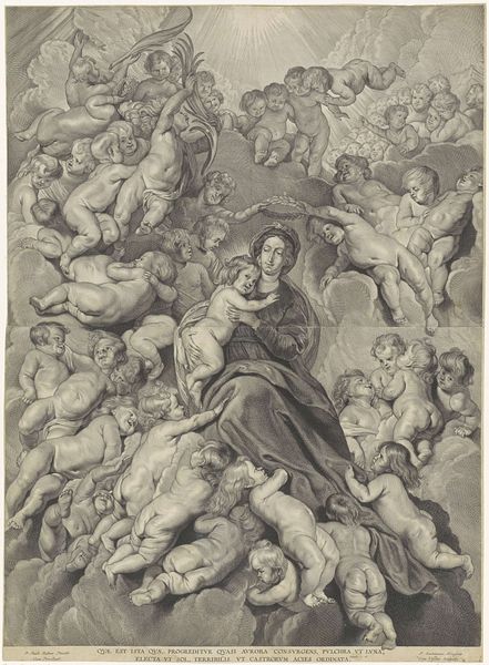 Achille Désiré Lefèvre created this print, "The Madonna of Saint Sebastian," utilizing engraving to bring forth a scene of heavenly intervention. Observe how Saint Sebastian looks upwards to the Virgin, in a composition reminiscent of classical apotheosis, suggesting a divine blessing bestowed upon the saints below. This motif of upward gazing finds echoes in works across time, from ancient Roman depictions of emperors ascending to the heavens to Renaissance paintings of the Assumption. The act of looking up, laden with yearning, becomes a visual metaphor for spiritual aspiration. Consider the gesture of supplication by Saint Germinianus, whose raised hand mirrors countless depictions of prayer across cultures, a primal expression of human hope. The Madonna's serene presence, surrounded by cherubic figures, evokes the collective desire for protection and benevolence. This image stirs deep, subconscious memories, connecting us to an age-old yearning for the sacred. It’s a testament to the enduring power of symbols in shaping our understanding of the world, and the emotional weight they carry across generations.