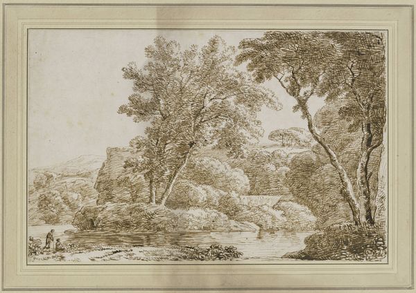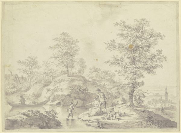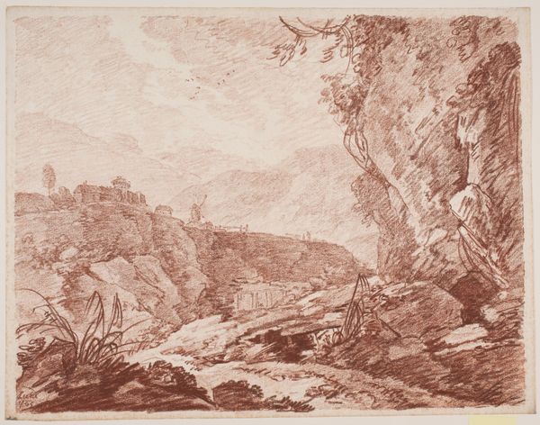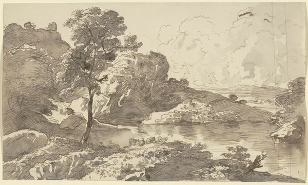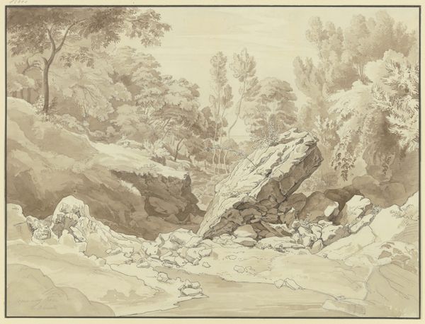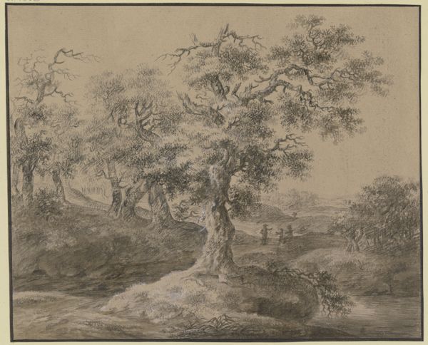 Curator: Before us, we have “Travelers in a Rocky Wood” by Johann Christoph Dietzsch, rendered in pencil and charcoal. The artist's name might not ring an immediate bell, but the drawing style captures something timeless about the human experience within nature. Editor: My first thought is… misty mornings. There’s this gauzy atmosphere, like a dream barely remembered. The strokes are delicate, almost hesitant, and I feel a quiet solitude emanating from it. Does that resonate with its themes at all? Curator: I believe so. Looking deeper, we can see familiar Romantic motifs: figures dwarfed by nature, rendered in monochrome to amplify a certain drama and introspection. These aren't carefree wanderers; their postures seem deliberate, burdened almost. Think about what "the forest" often represents: a place of trials, unknowns, and the confrontation with the self. Editor: Absolutely. The woods become a stage for inner dramas. I see that play out in the composition. One figure on horseback appears on the upper left like an apparition and then closer to us, we have a man on foot, and what appears to be his canine companion… almost like they're emerging from, or disappearing into, this charcoal dream. The lack of defined light enhances the mystery. Are there hidden meanings, you think? Curator: Certainly! Consider the symbolism of the dog as a signifier of fidelity, guidance. The horse too, might represent freedom, a noble path. Placed within the "rocky wood"—itself symbolizing obstacles—the journey these travelers undertake becomes both physical and deeply symbolic, representing perhaps our own struggles, resilience, and companionship on our unique paths. It evokes something universal about facing our own challenges. Editor: So beautifully put. Thinking about symbols embedded like clues waiting to be unlocked--it invites multiple interpretations, that’s what I love about this work. It's like glimpsing a forgotten page of a fairytale. Curator: Fairytale, or perhaps an archetype… Dietzsch captured something hauntingly recognizable in our collective consciousness. Editor: True…it’s made me see my own journey in a different light today. Curator: As has it done for me. The echoes of old tales linger still, don’t they?
